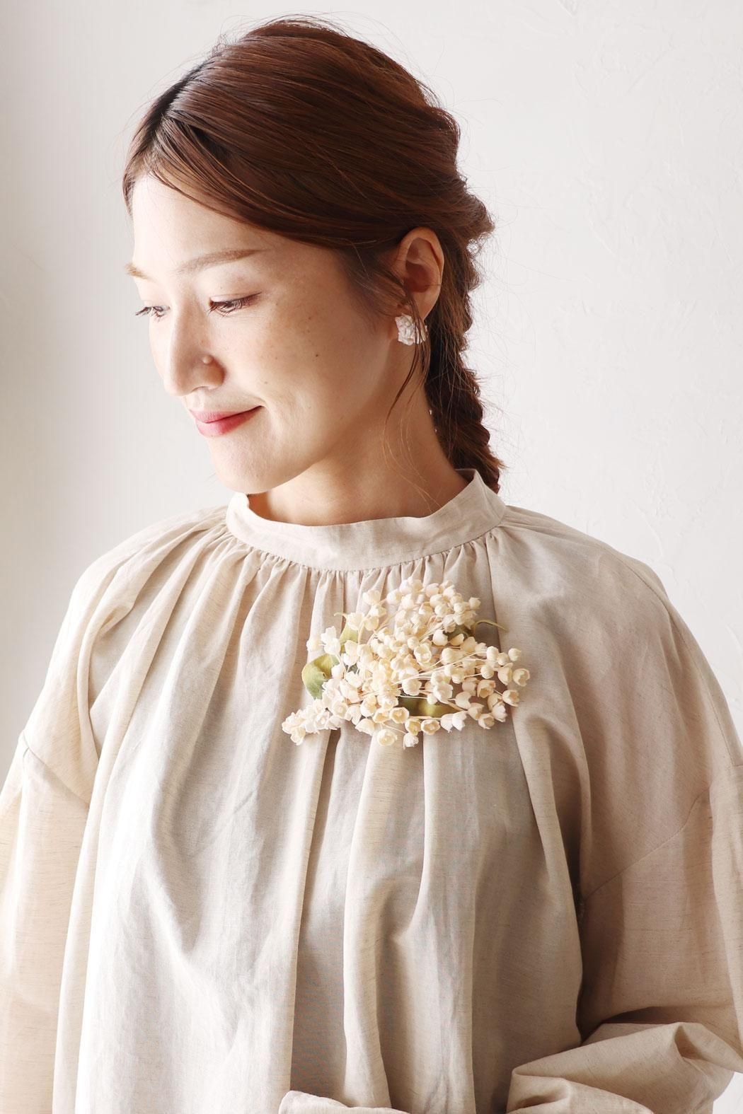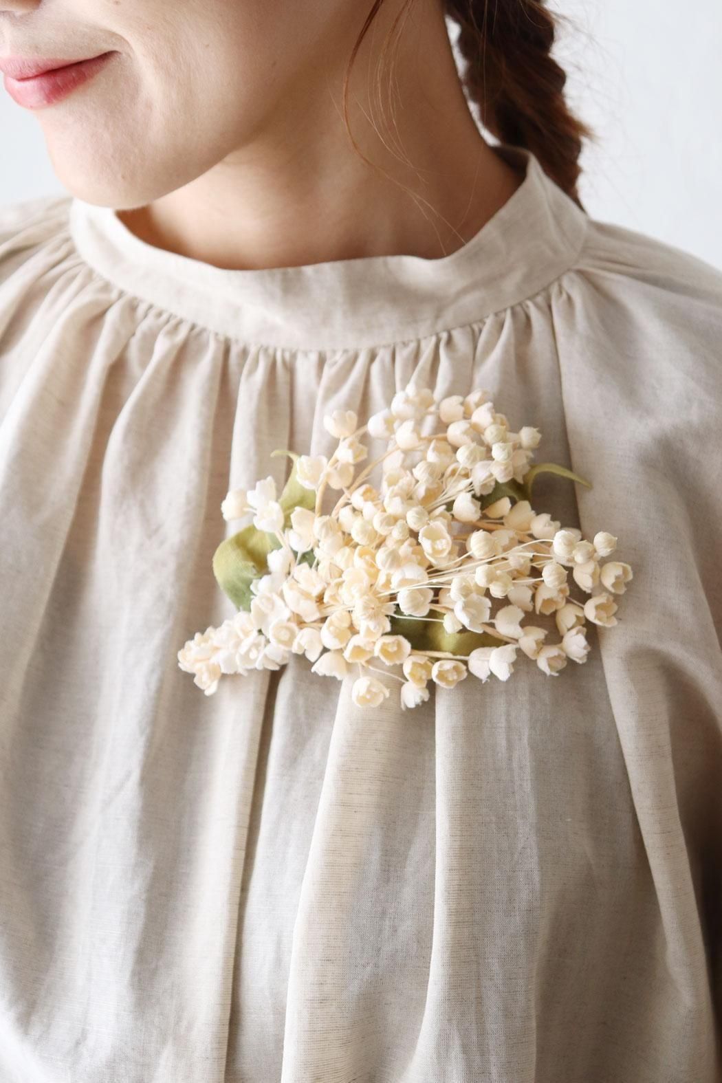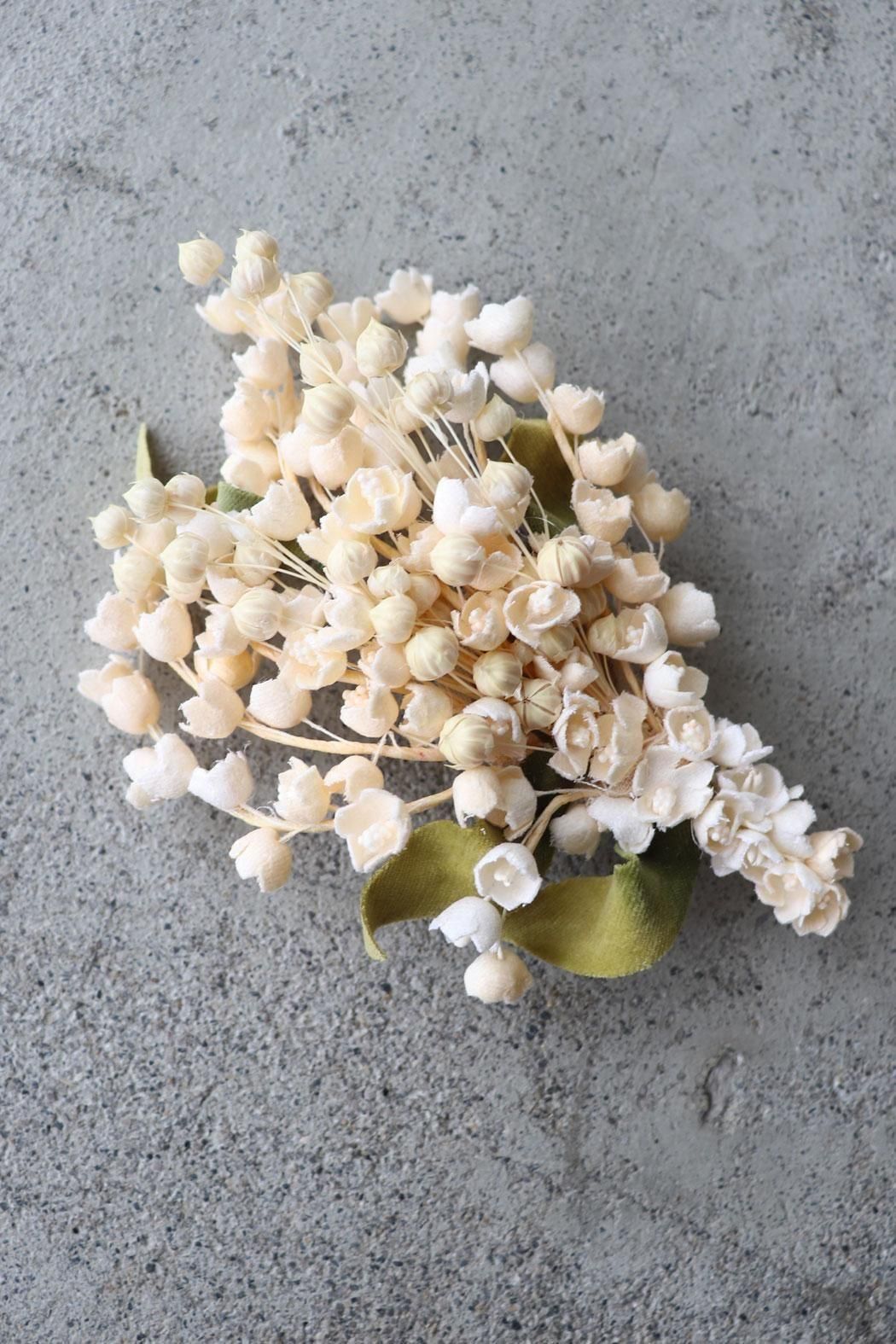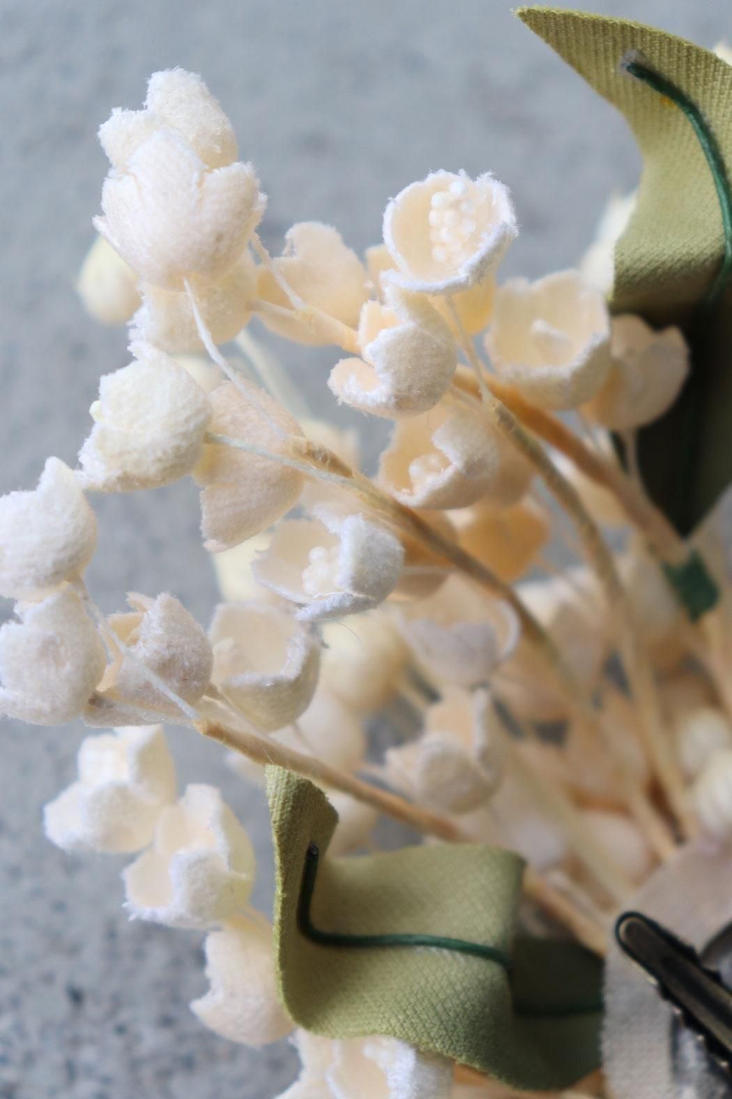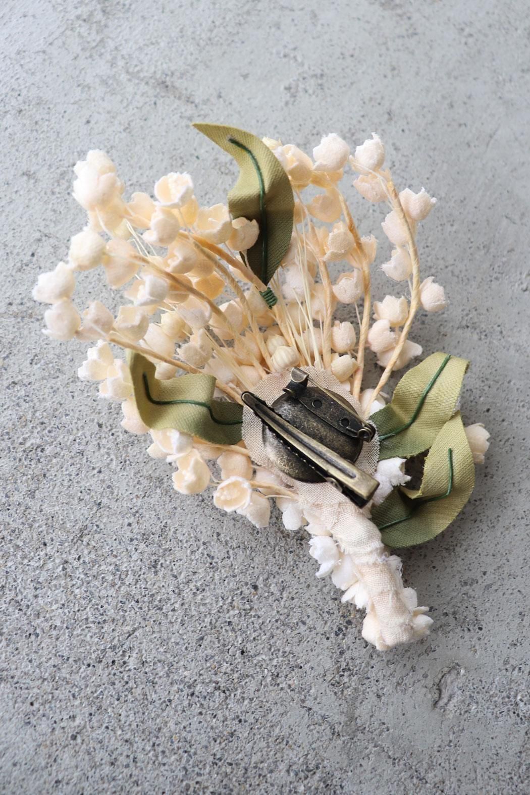 すずらんをモチーフにした、上品でクラシカルな印象のコサージュ。