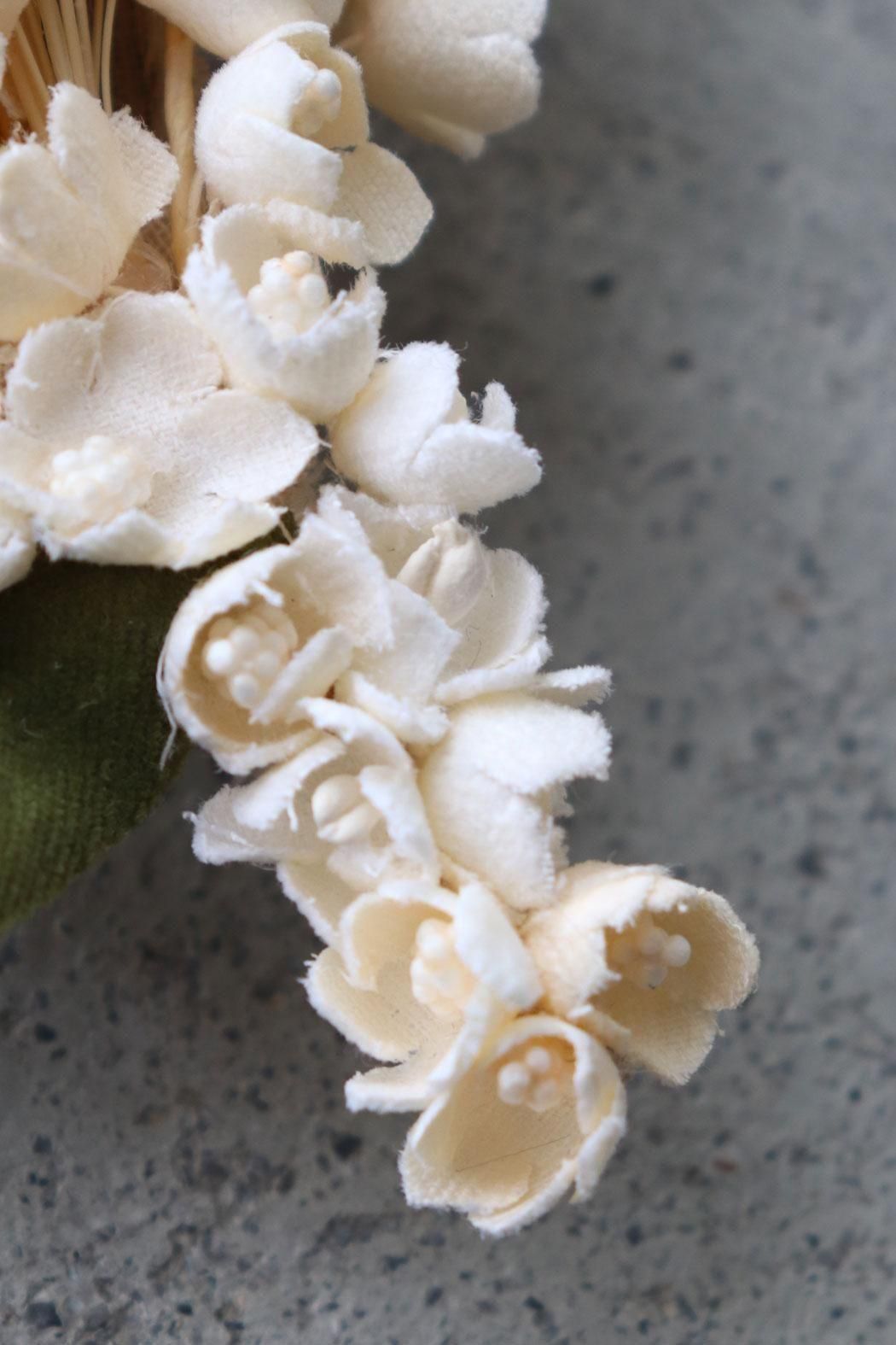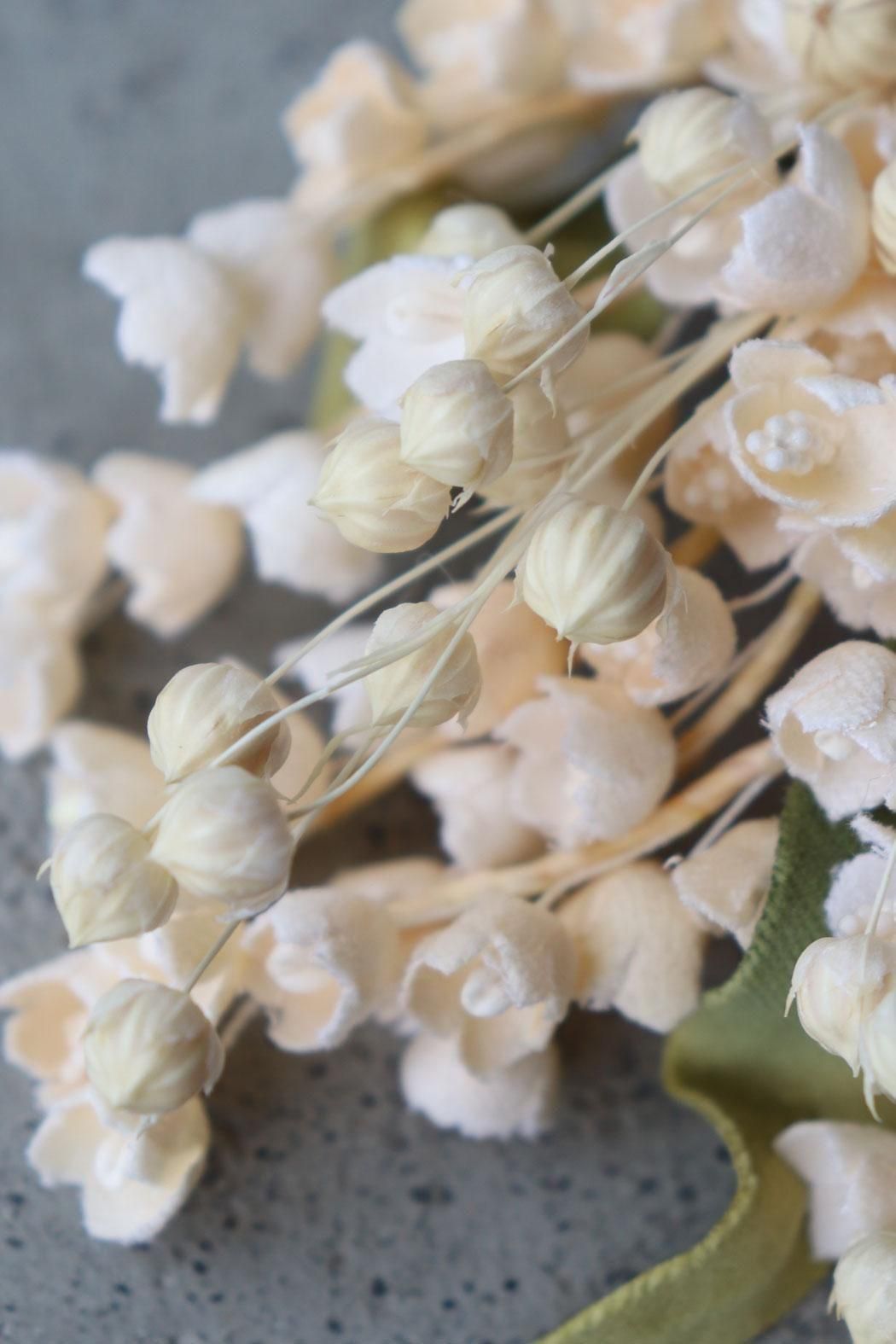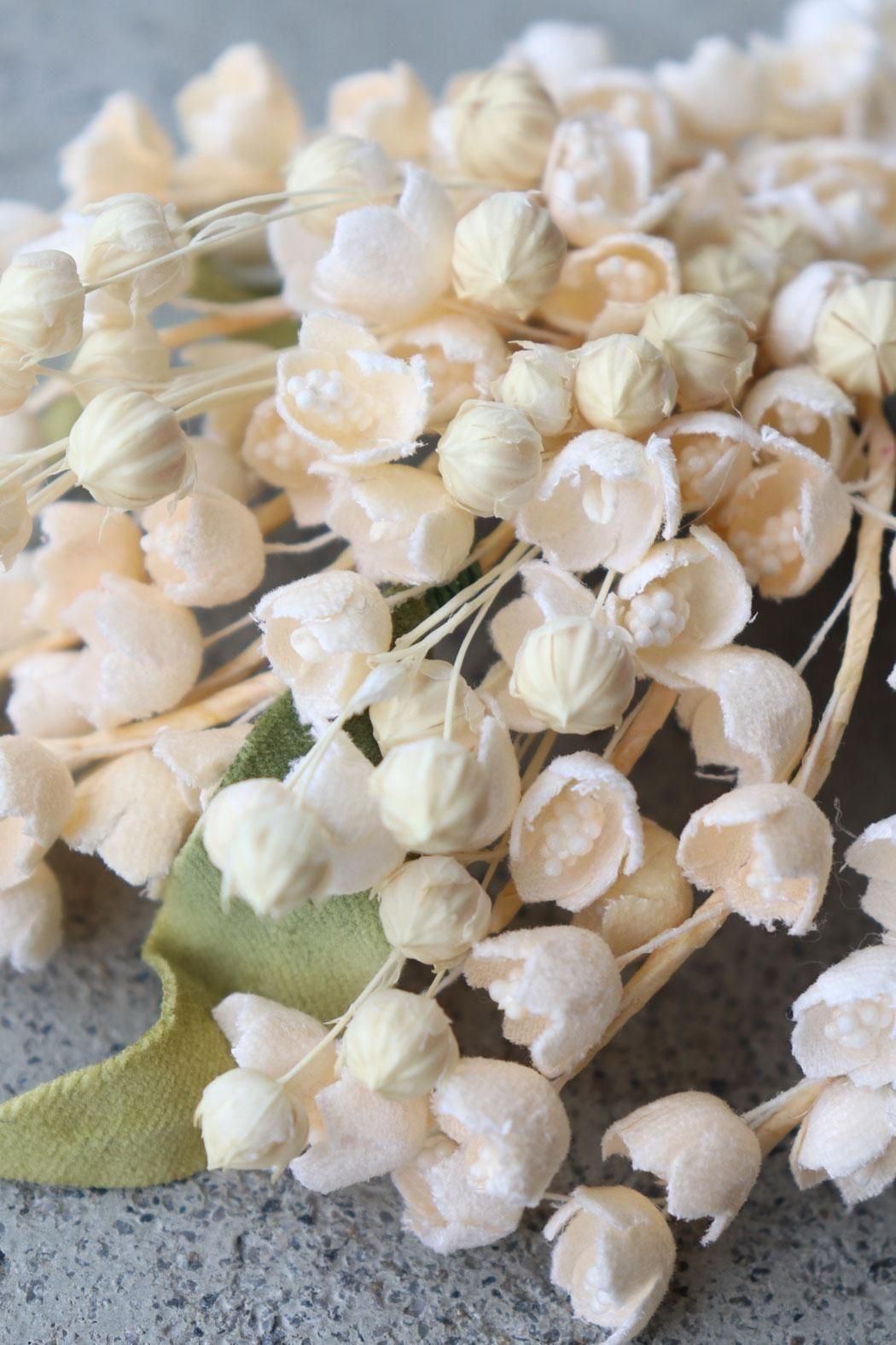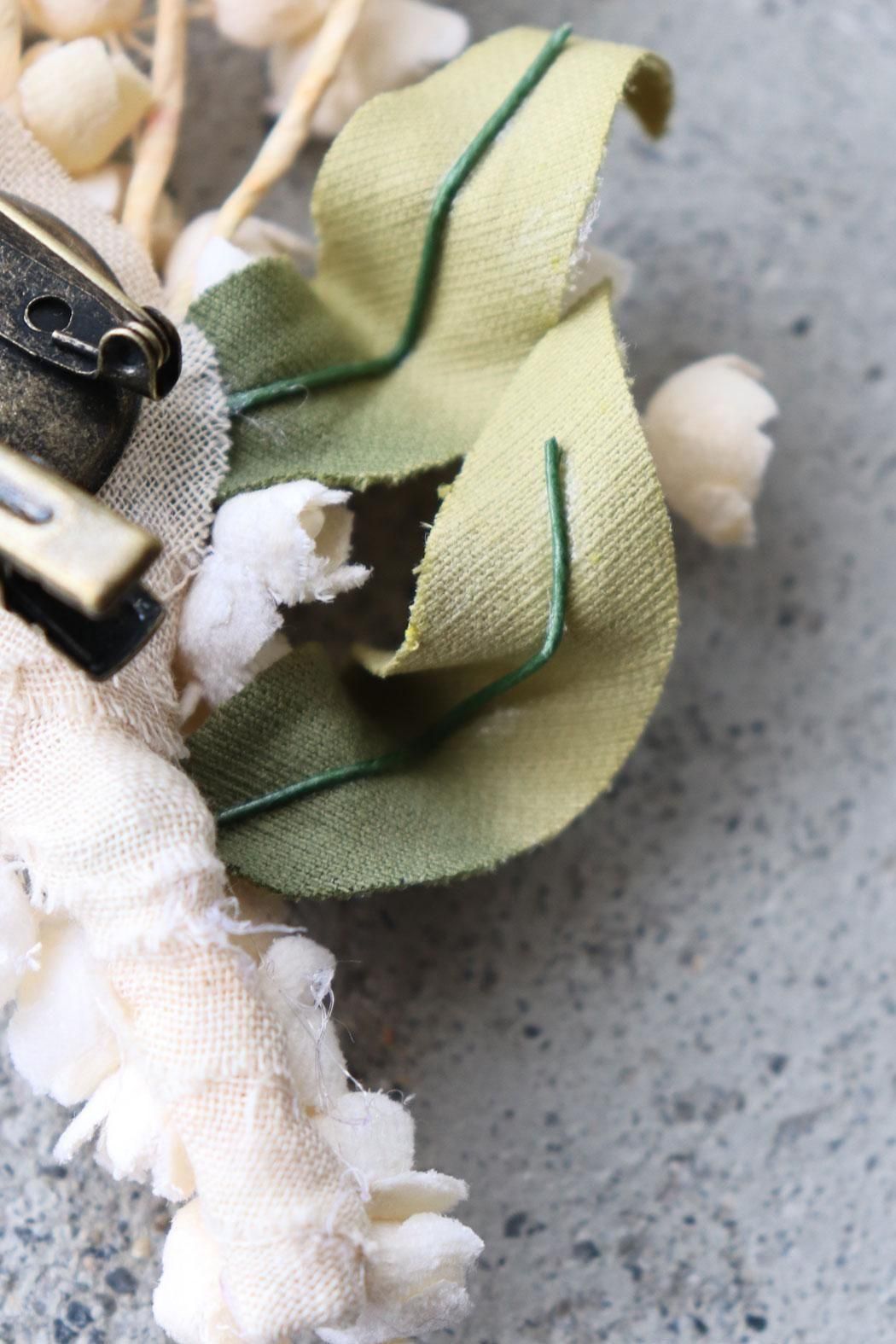 すずらんをモチーフにした、上品でクラシカルな印象のコサージュ。