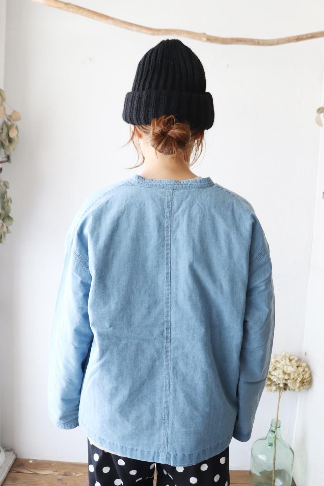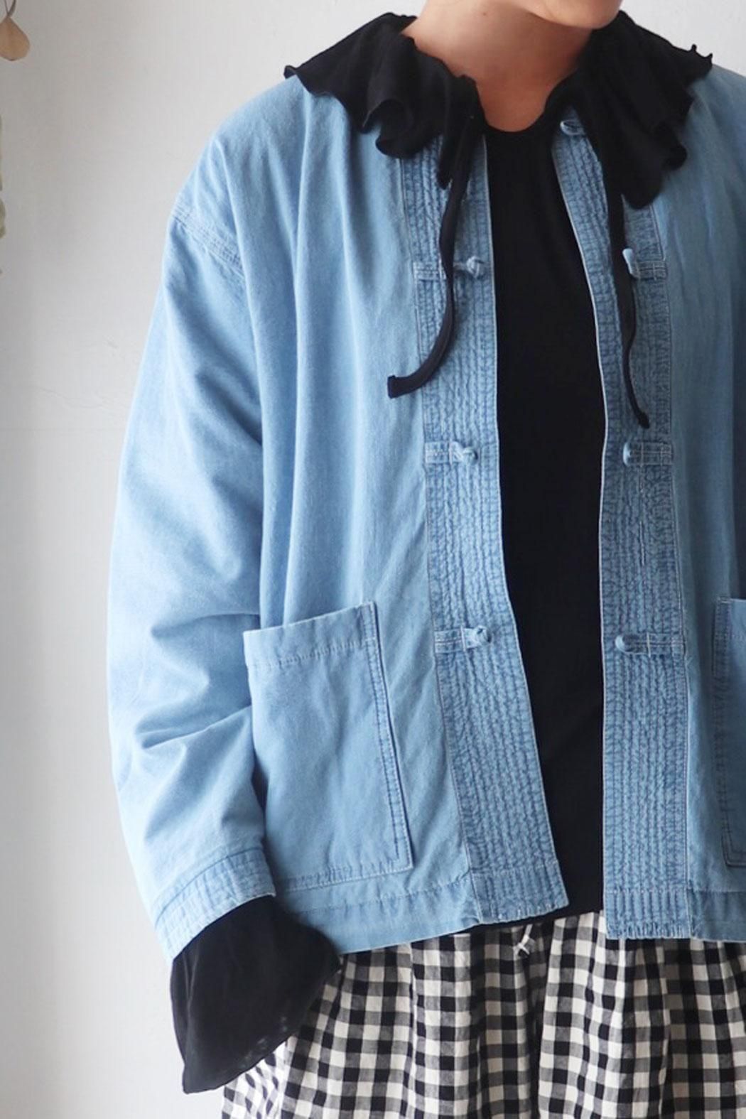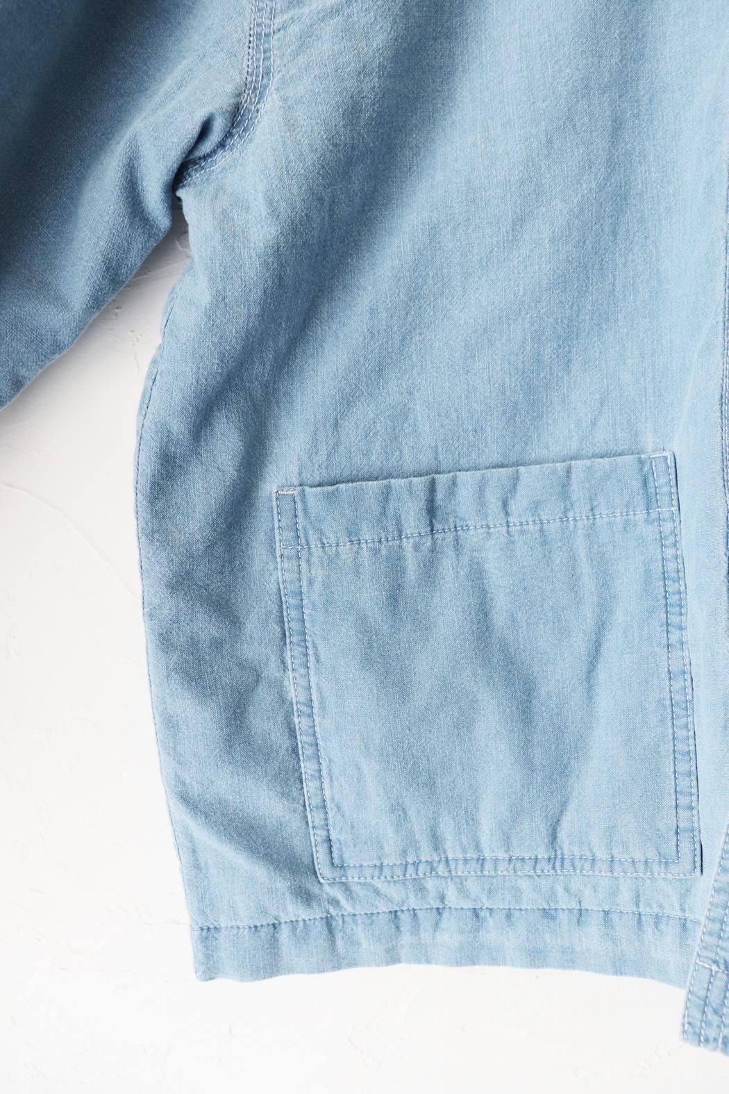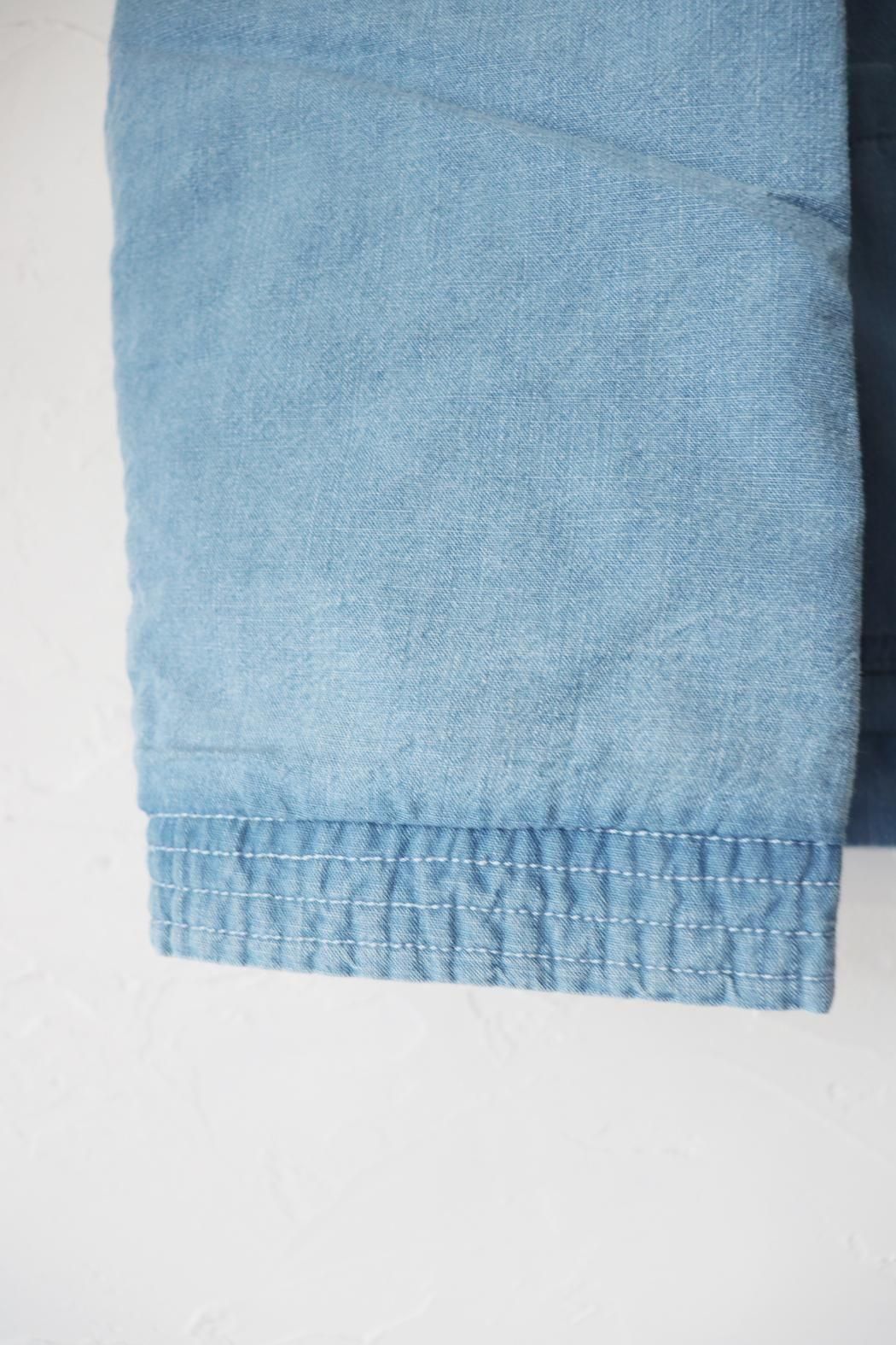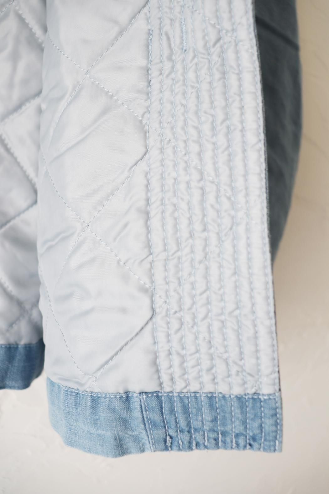 インディゴシャンブレー素材を使用したキルトジャケット。