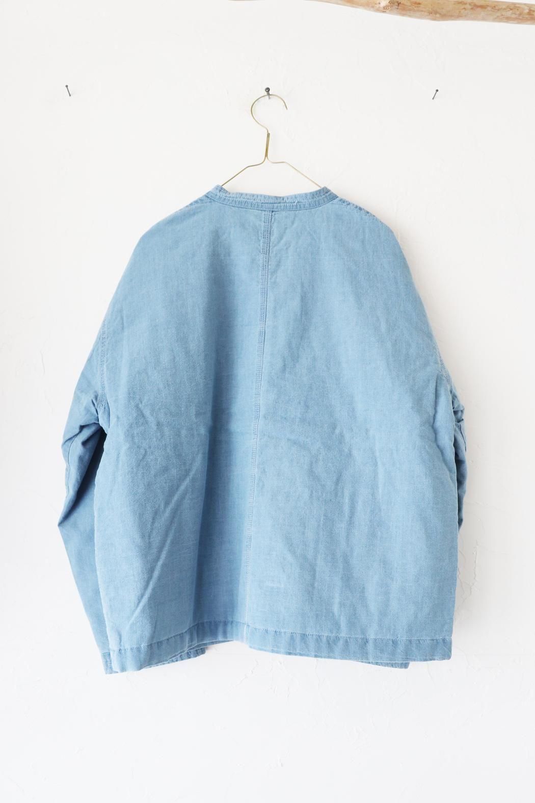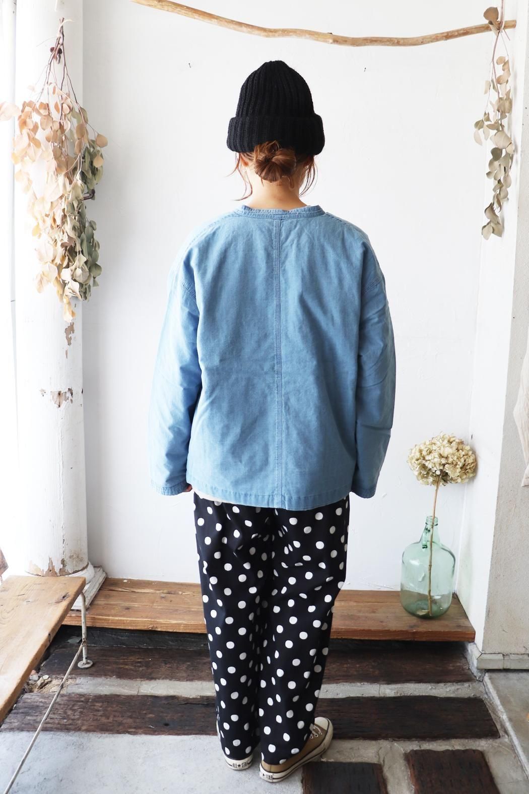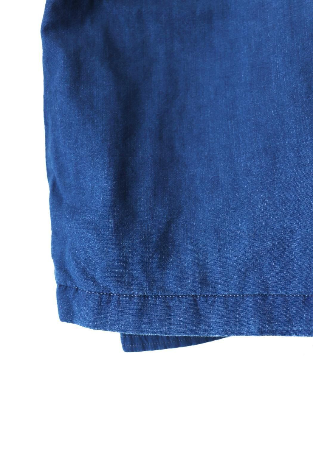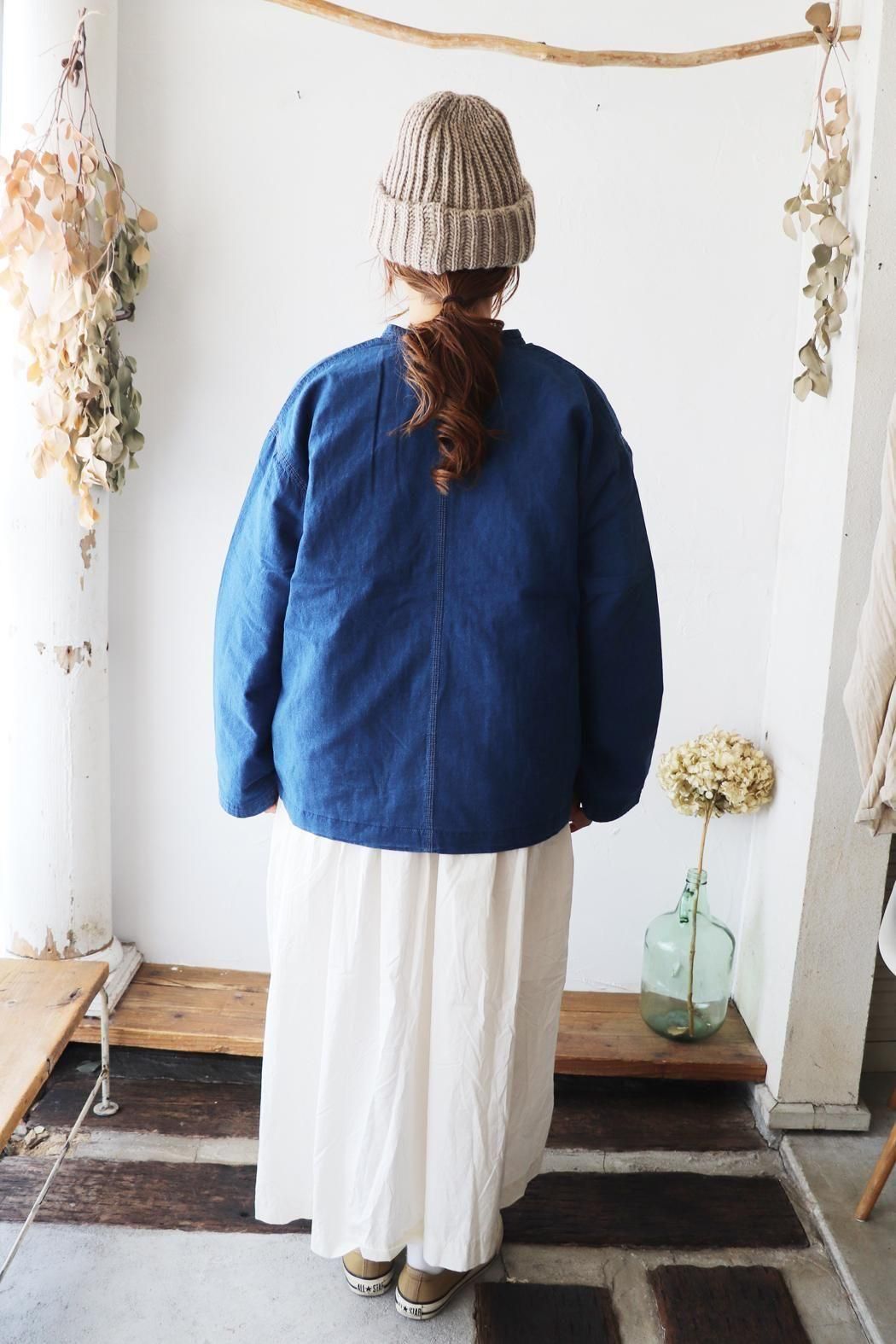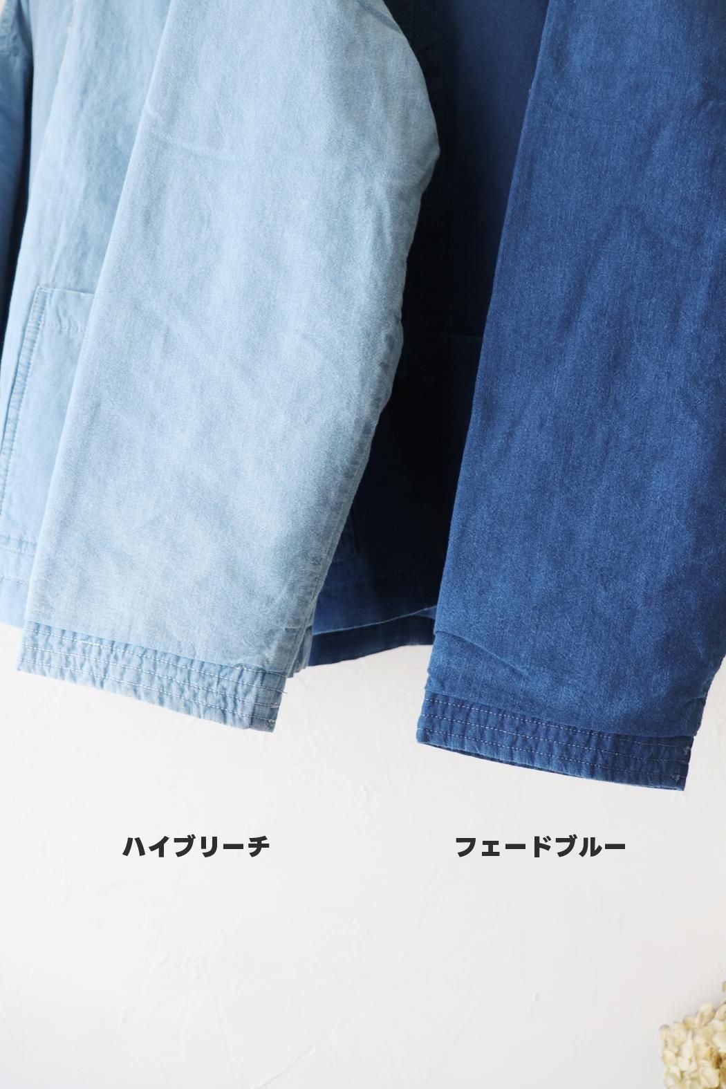 インディゴシャンブレー素材を使用したキルトジャケット。