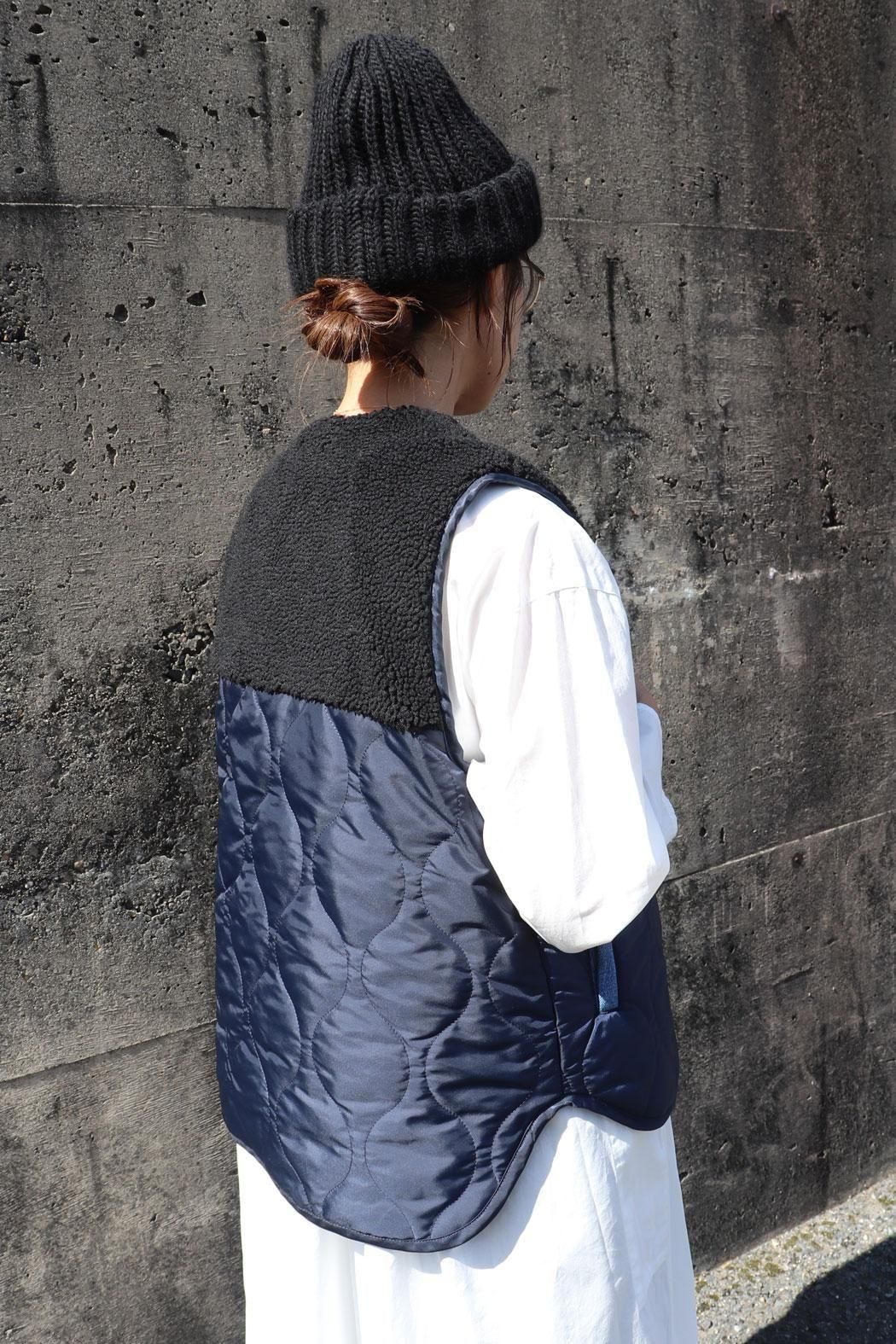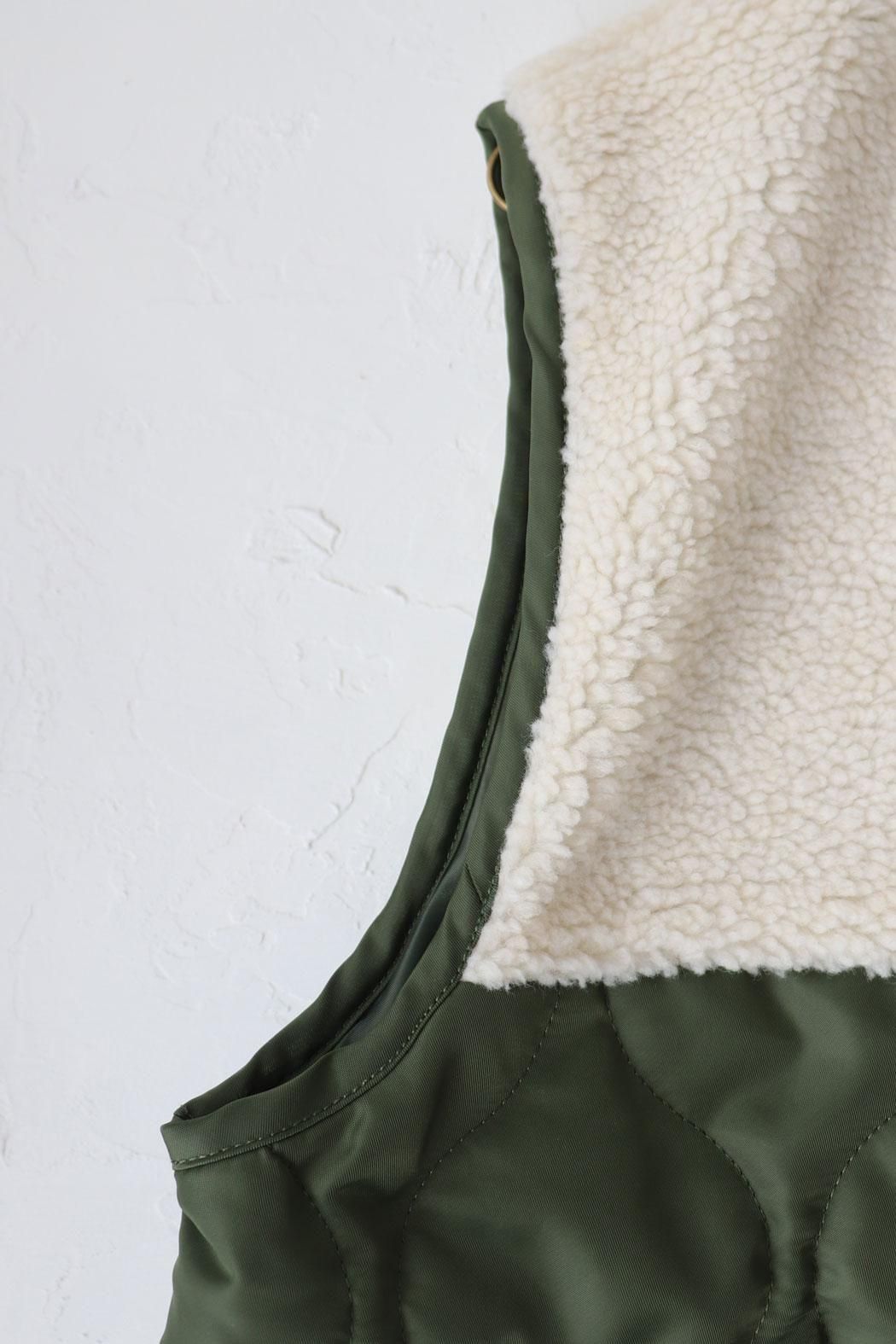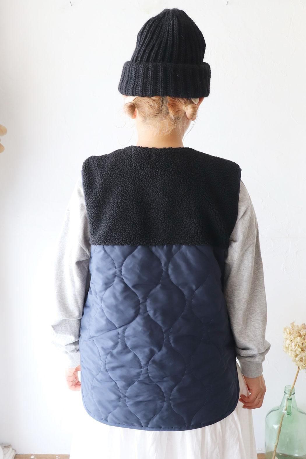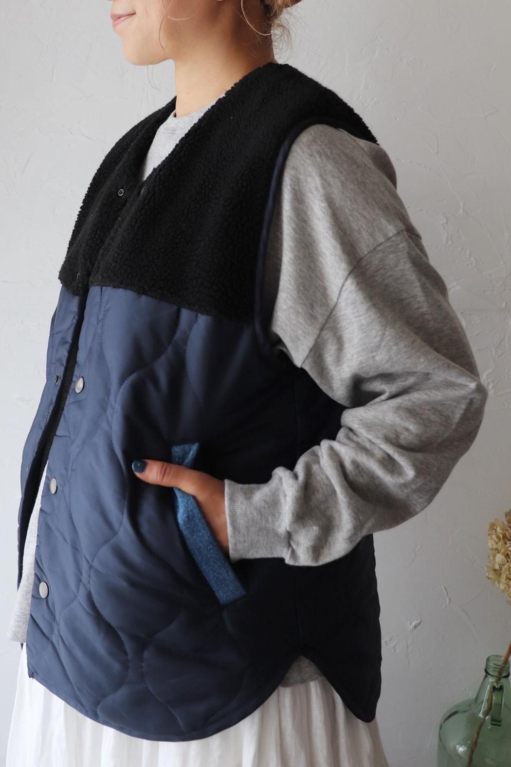温かみのあるボアと光沢感が大人っぽいキルトを組み合わせたベスト。