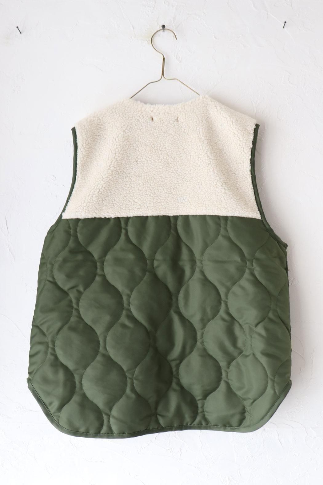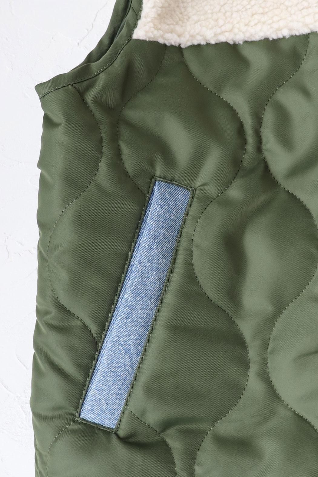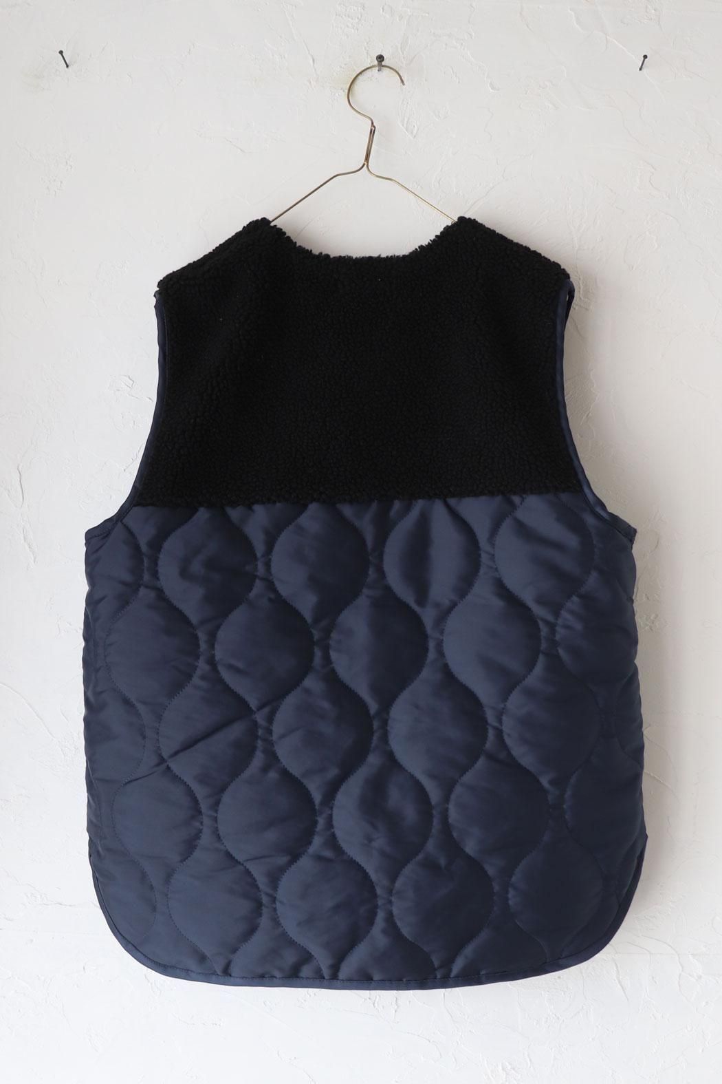 温かみのあるボアと光沢感が大人っぽいキルトを組み合わせたベスト。