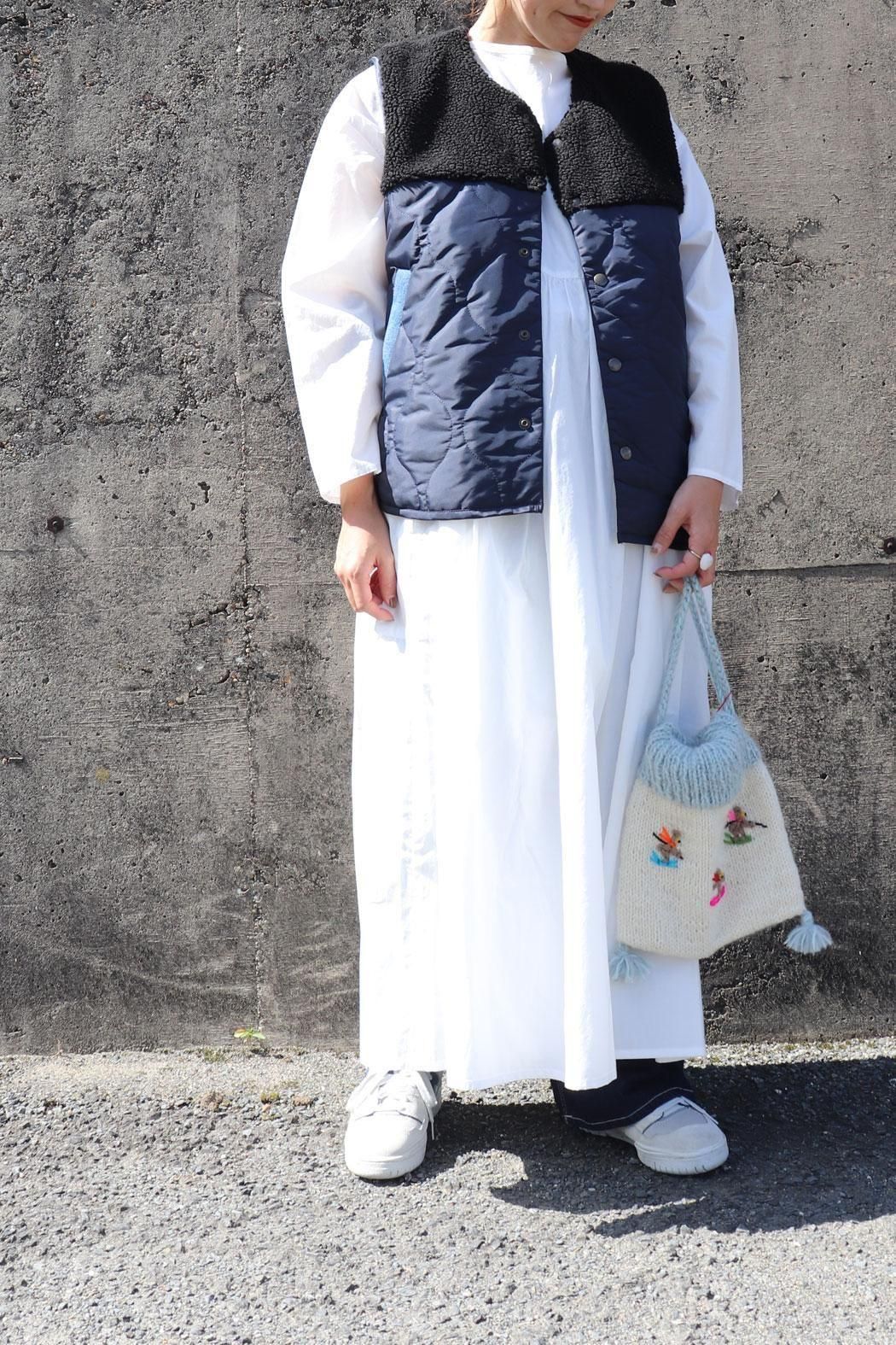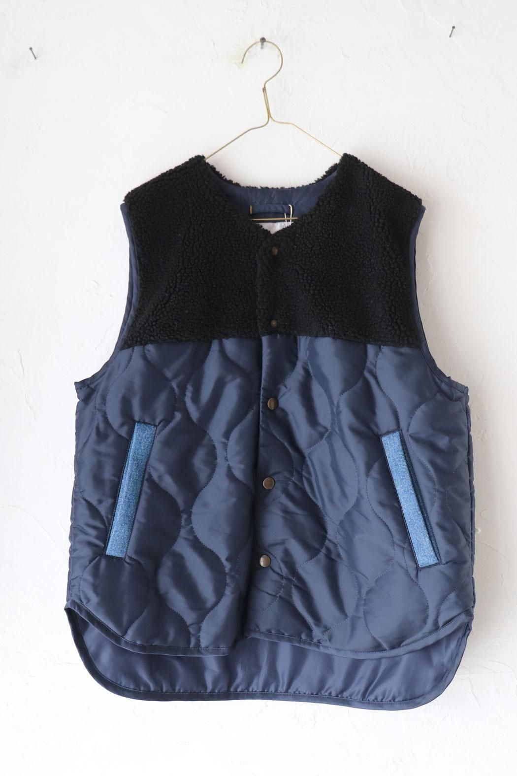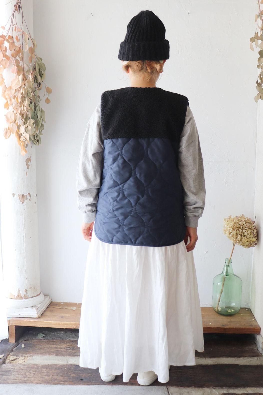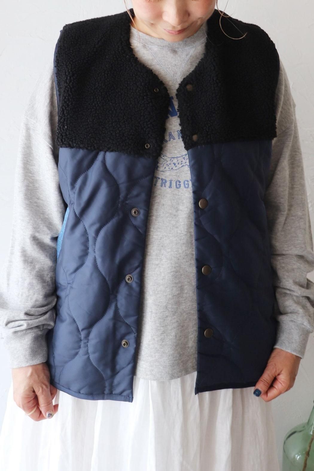 温かみのあるボアと光沢感が大人っぽいキルトを組み合わせたベスト。