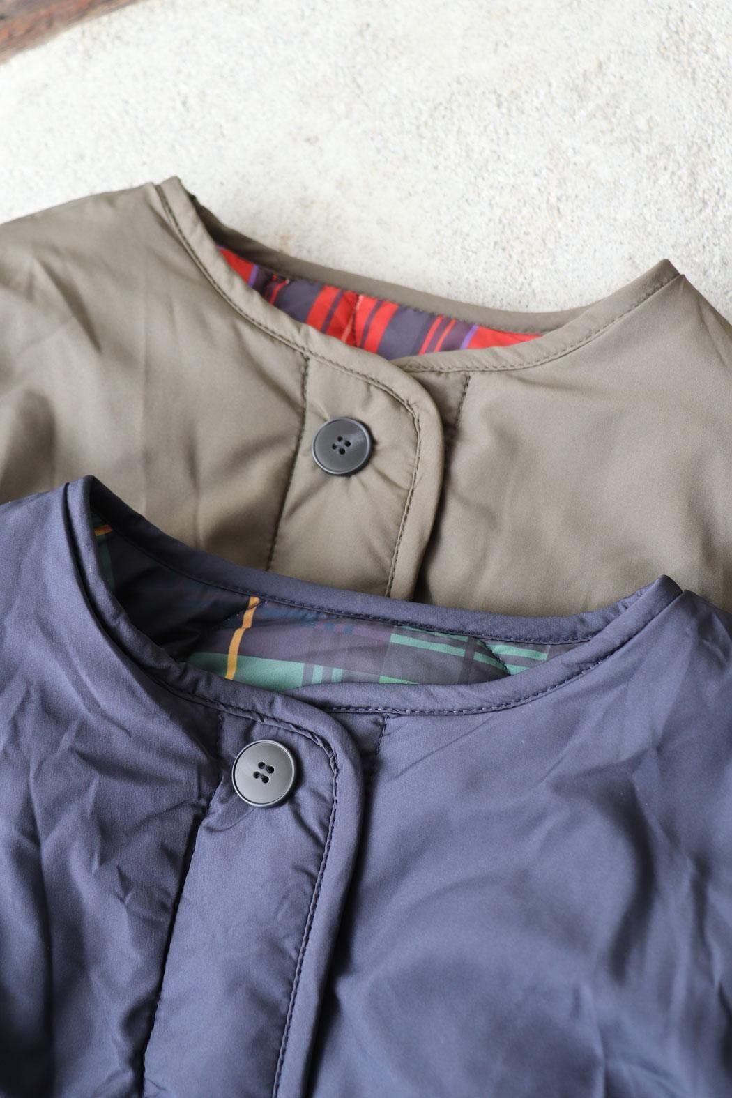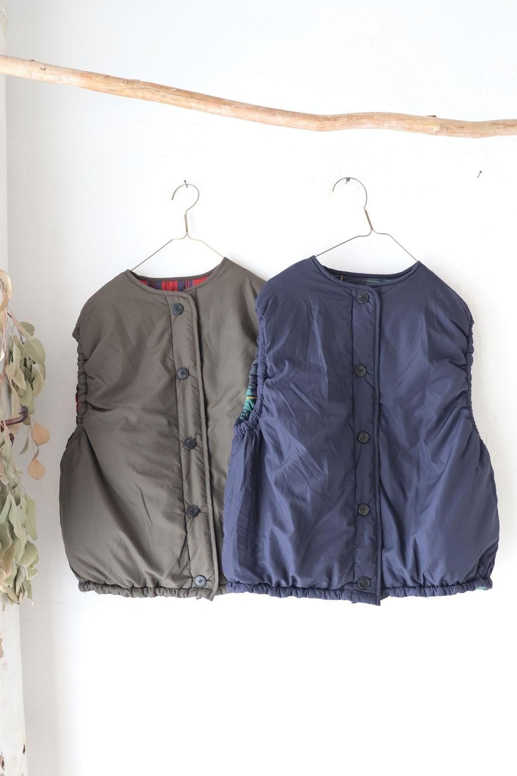 チェック柄と無地のリバーシブルで楽しめるキルトベスト。