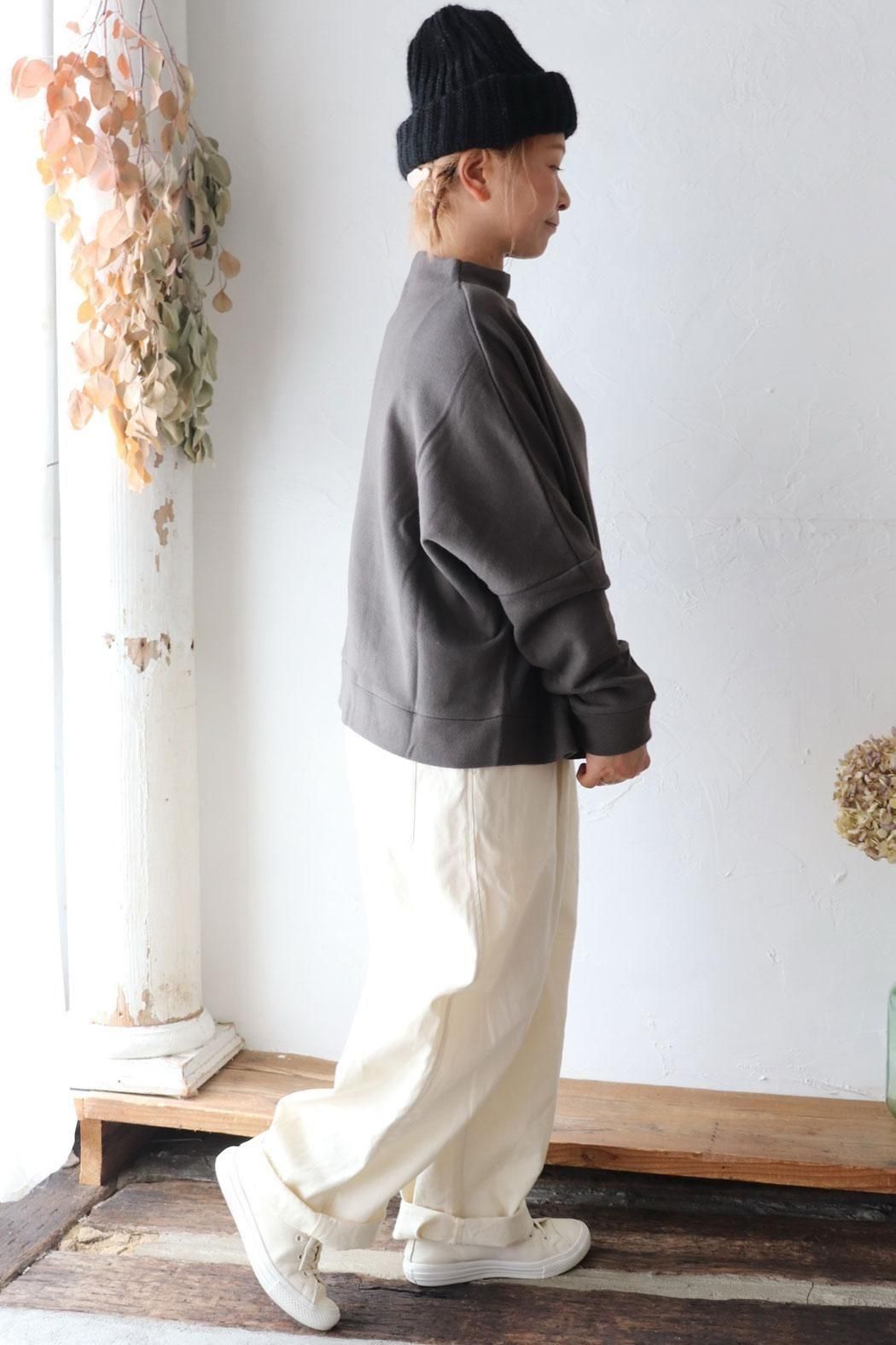 ゆったりとした身幅と、首元をすっきり見せるモックネックが、