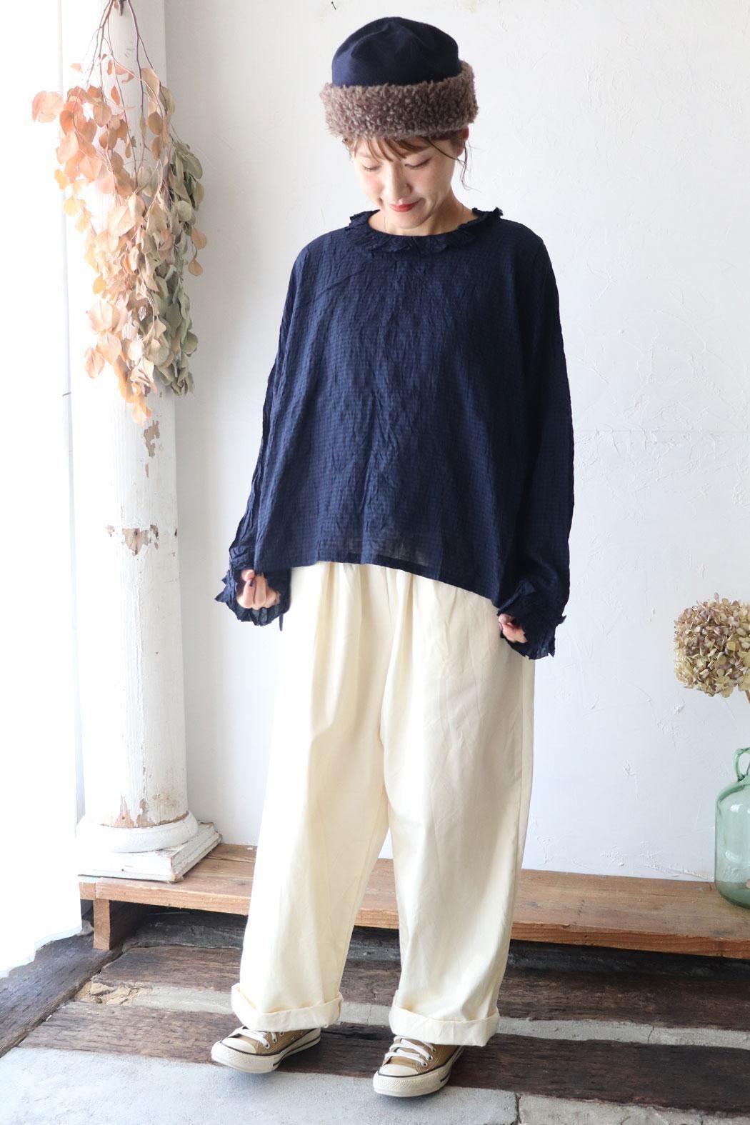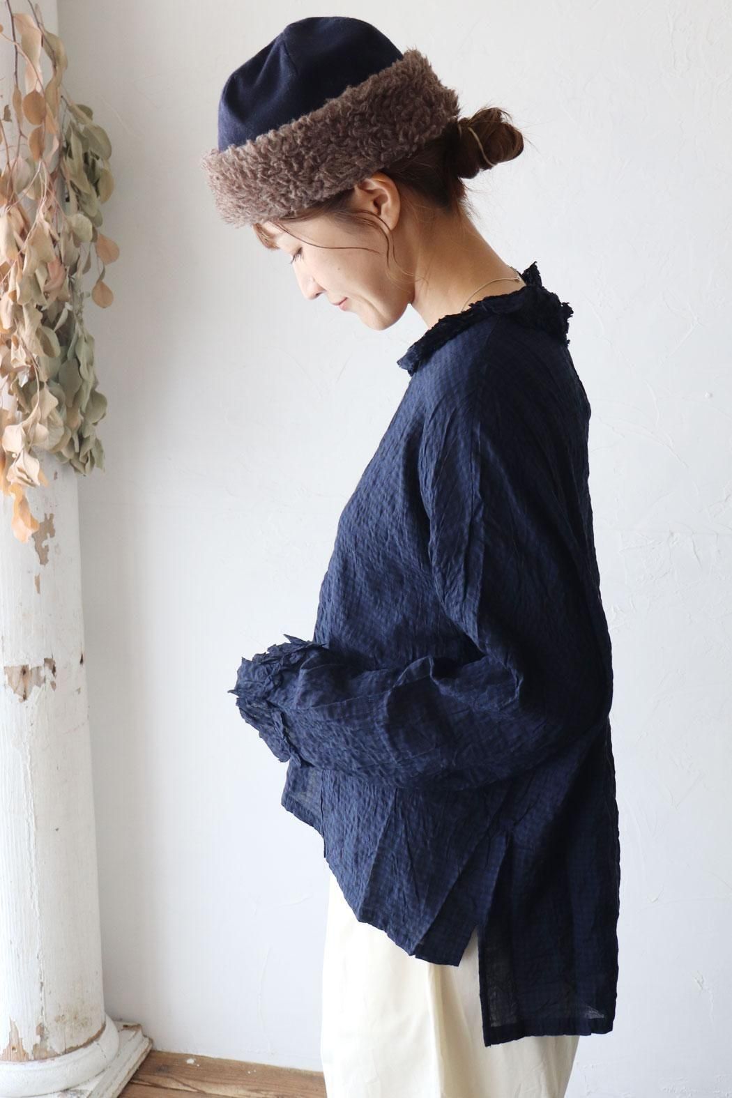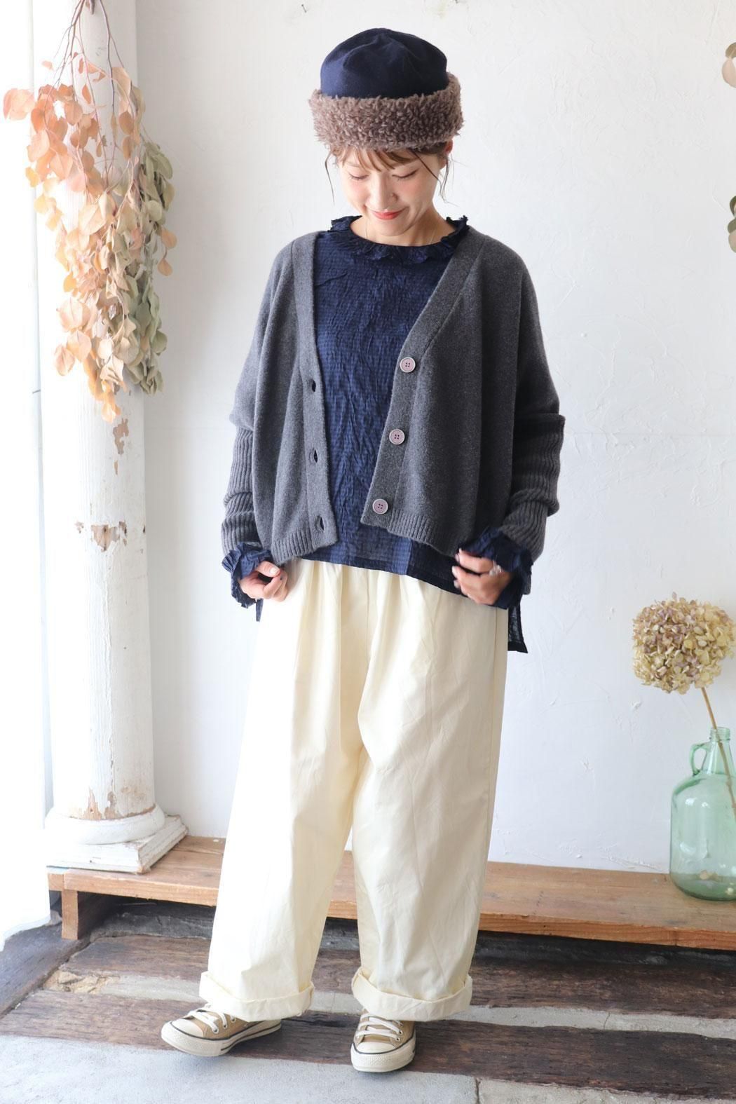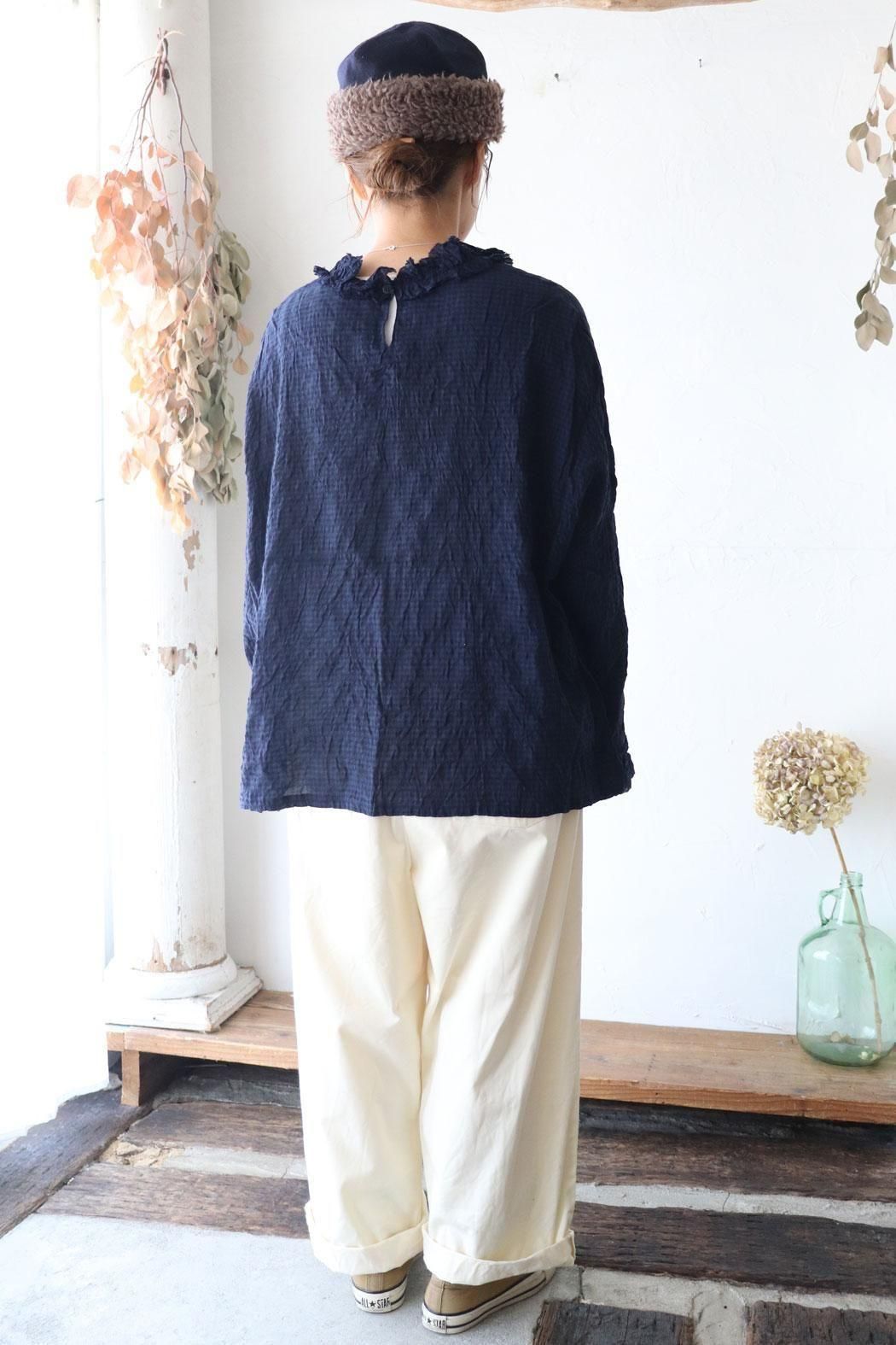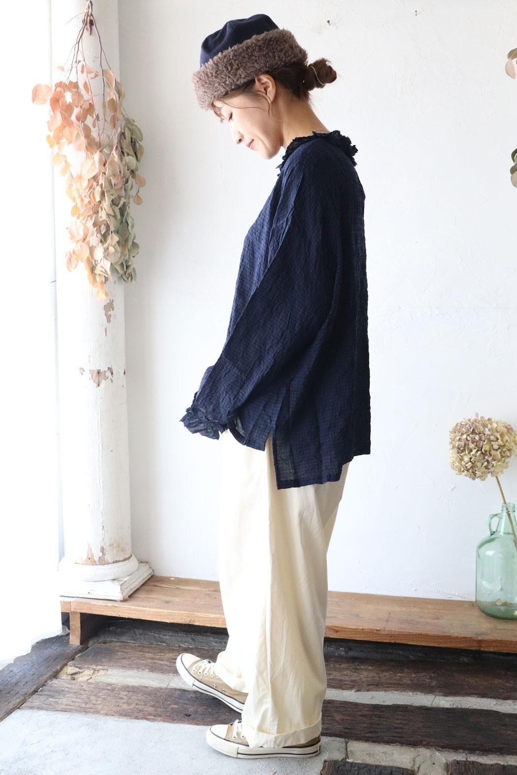 衿元と袖口に切りっぱなしのフリルをあしらい、大人可愛い雰囲気を演出*
