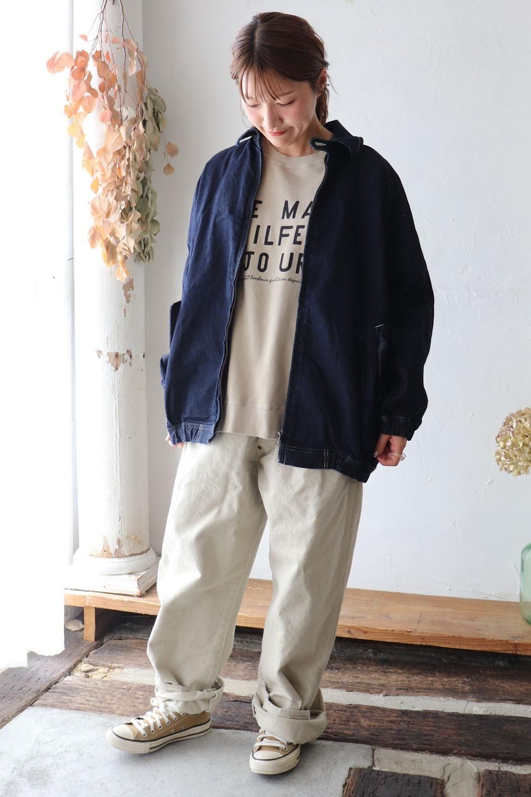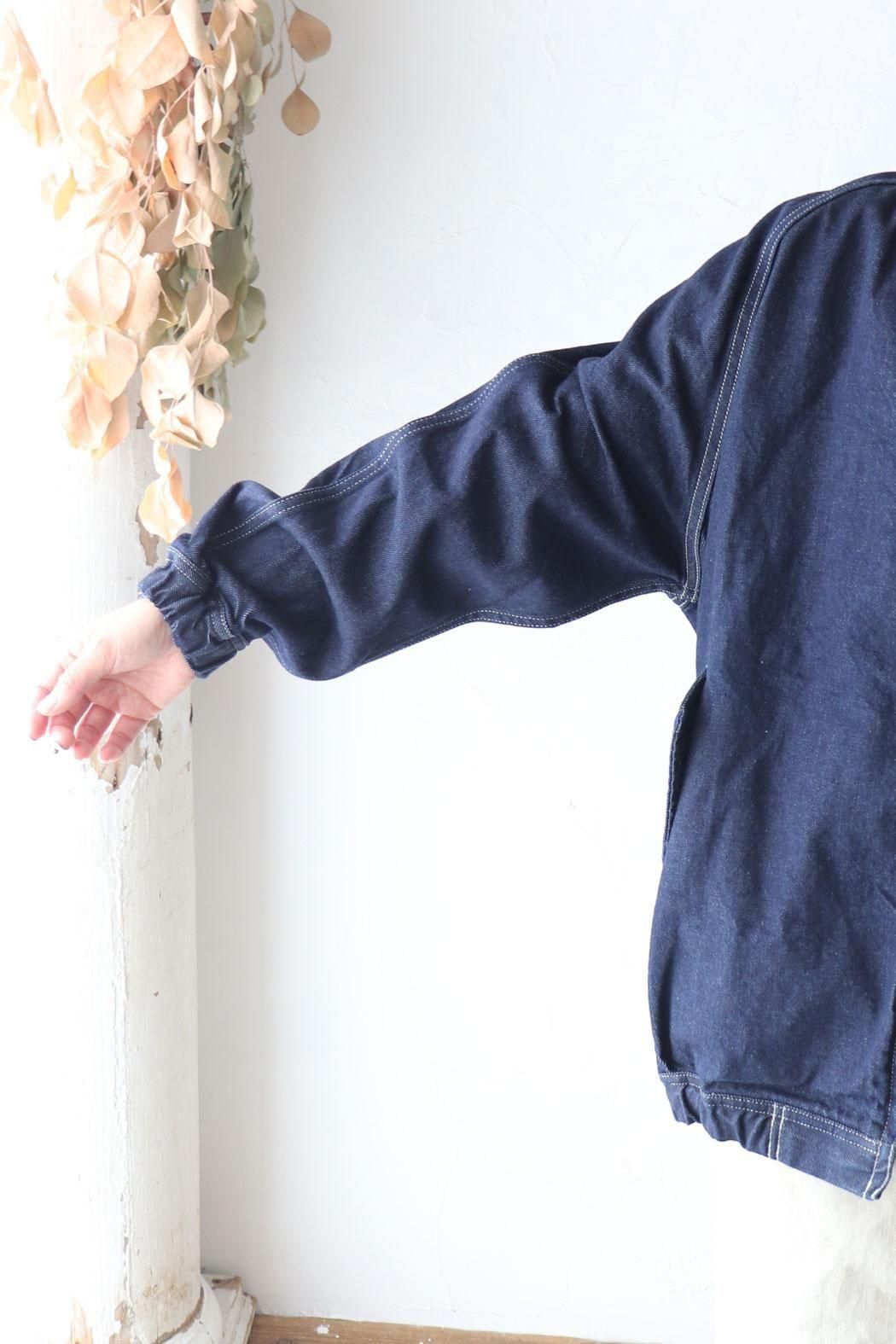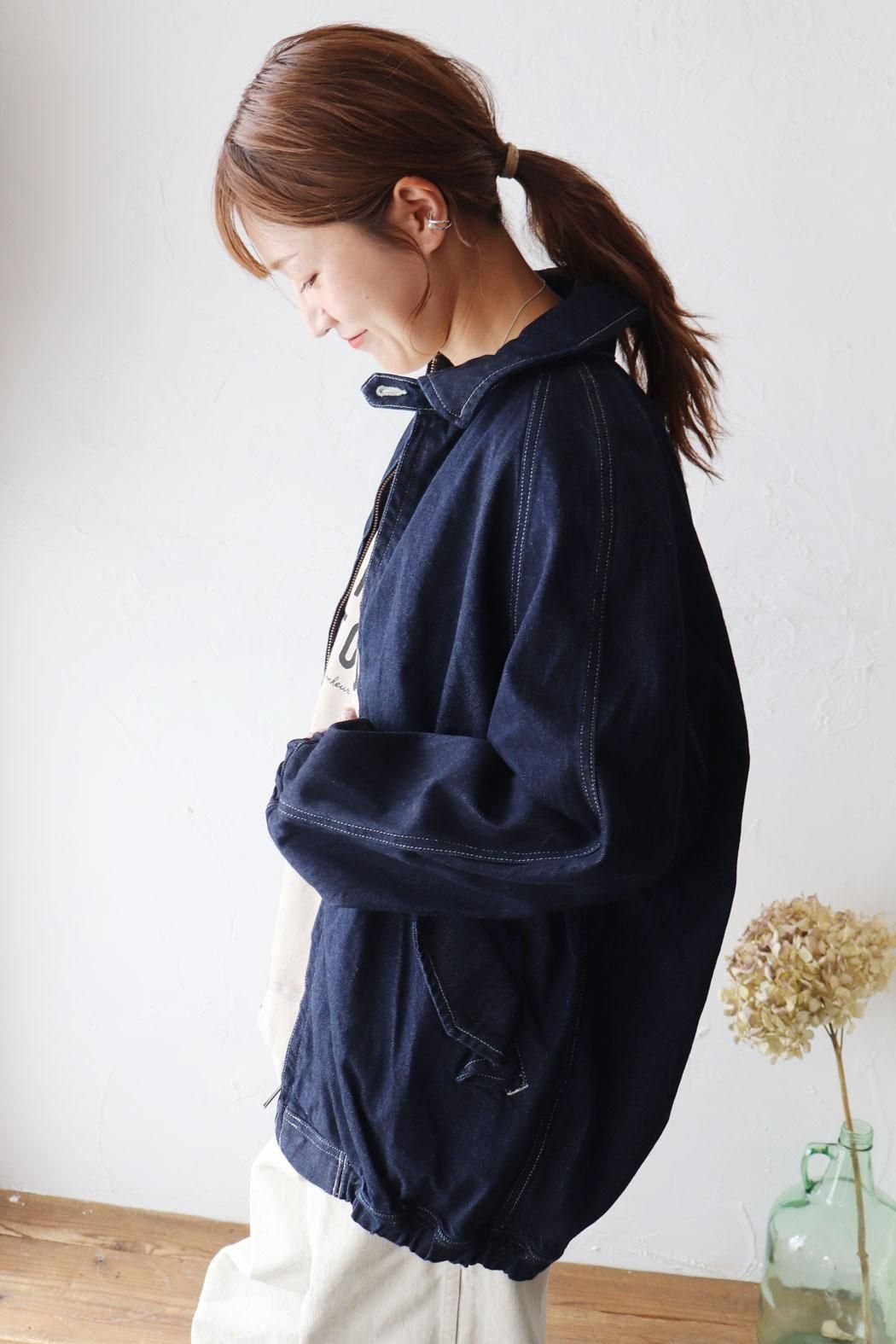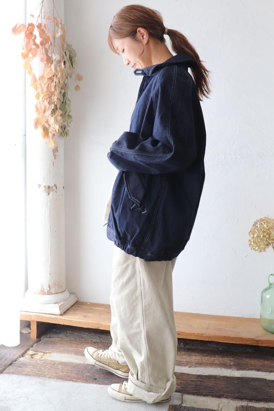 肩をやや落としたゆとりのあるサイズに、裾と袖口にゴムを入れる事でシルエットに変化を加えました。