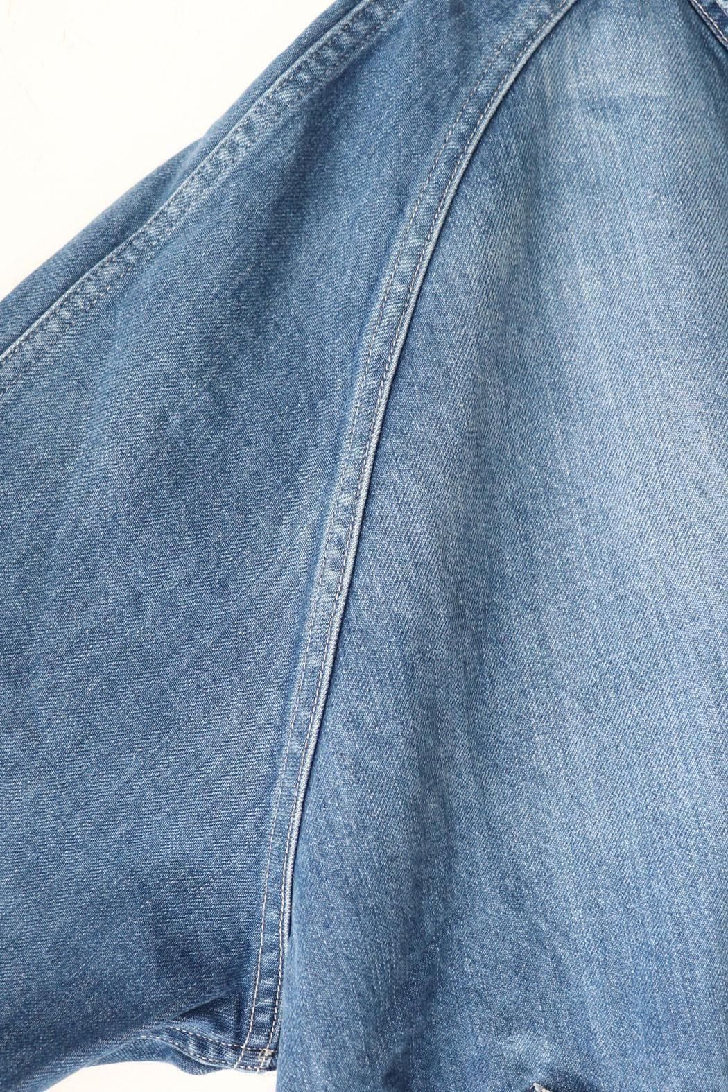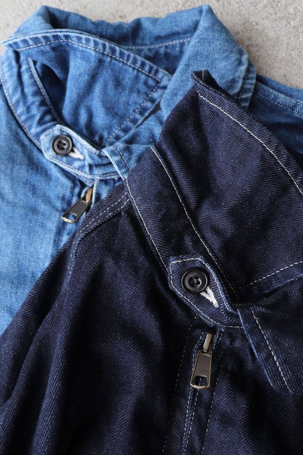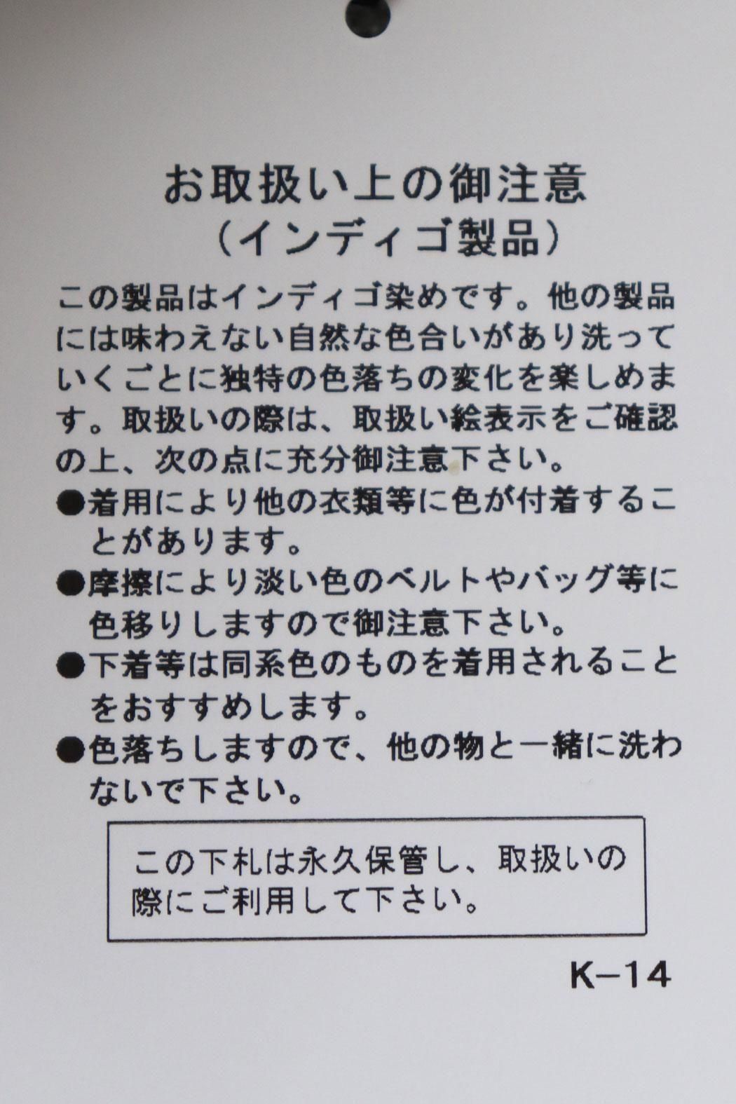 ピュアインディゴを用い、糸の中心が白く残るロープ染色をしているためアタリが出て経年変化を味わうことが出来る1着〇