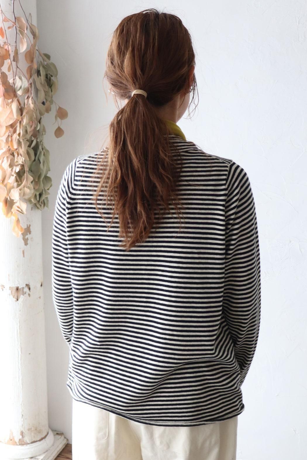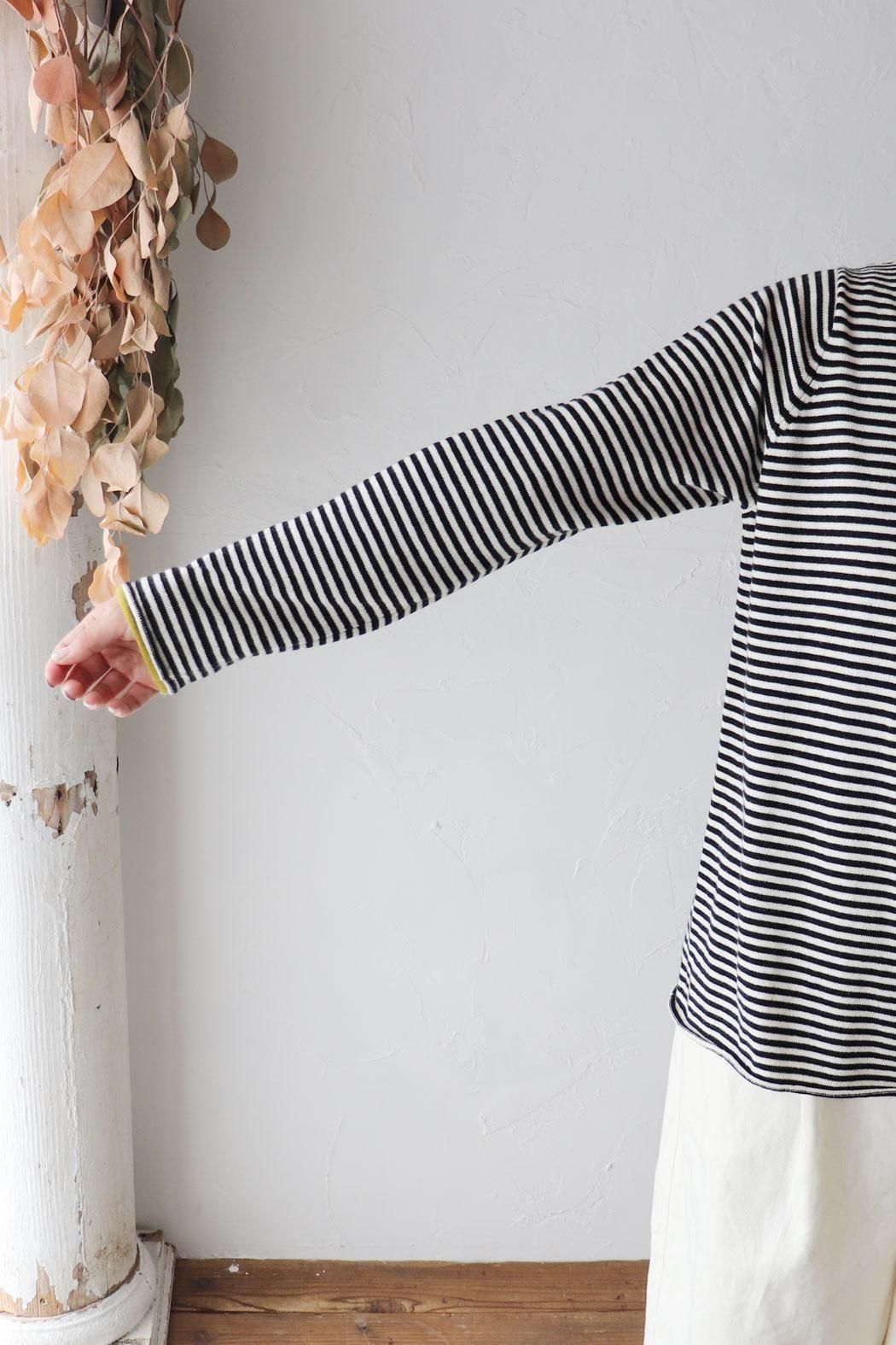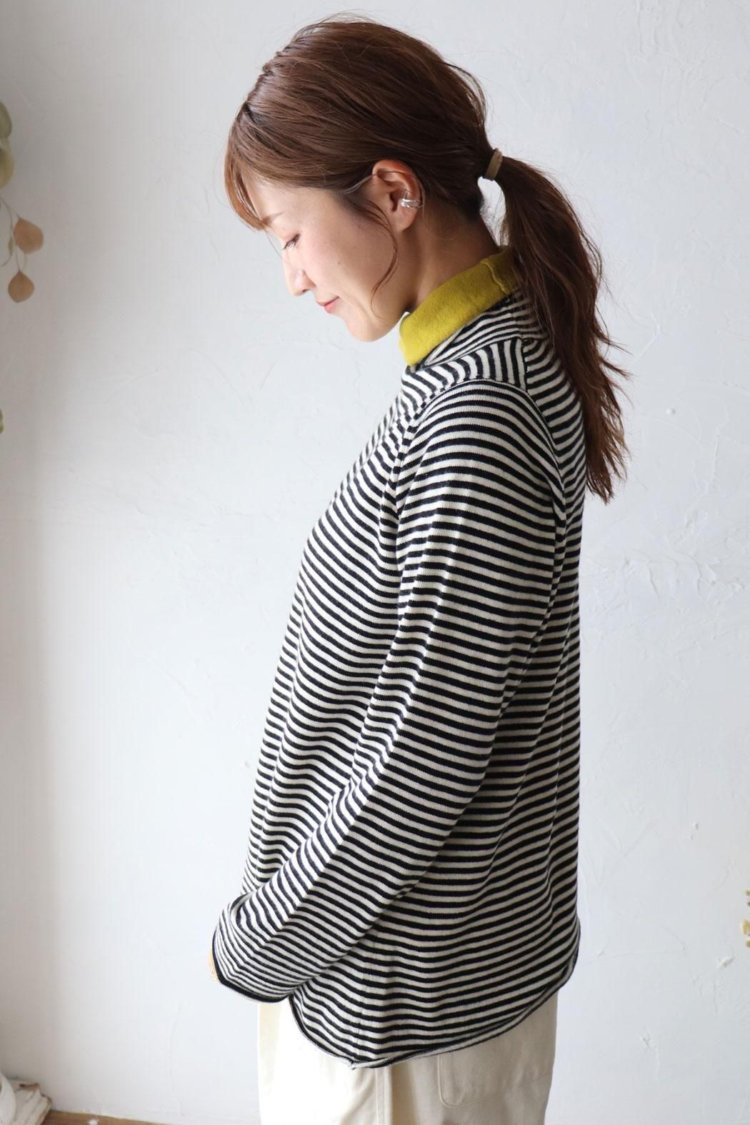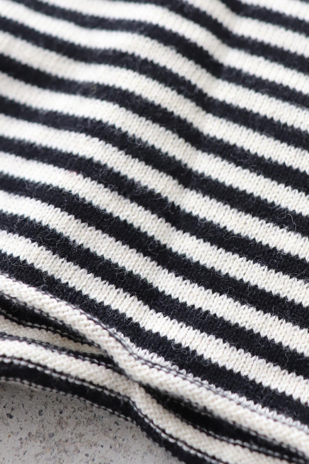 肌触りが良く身体に張り付かない編地のボーダーニット。