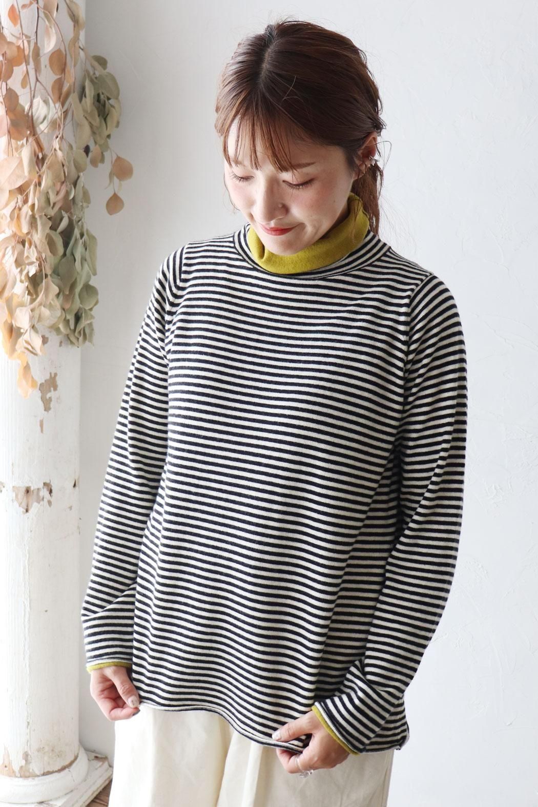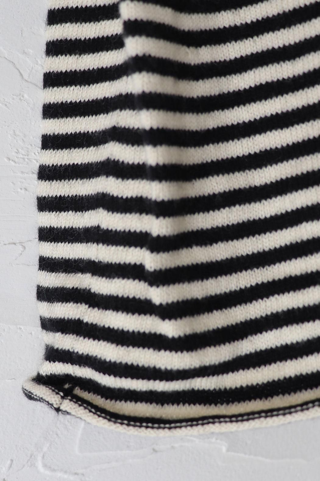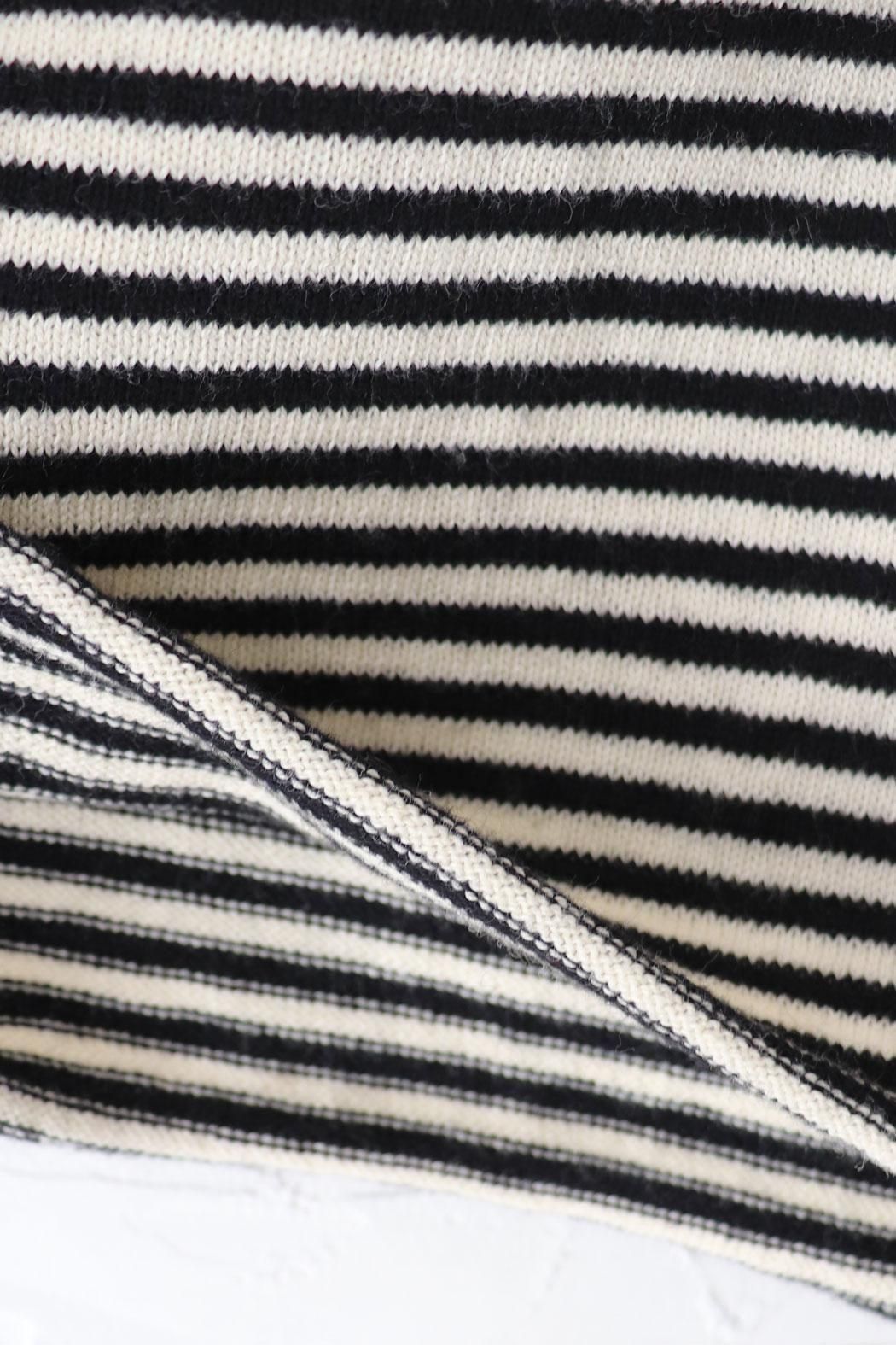 肌触りが良く身体に張り付かない編地のボーダーニット。