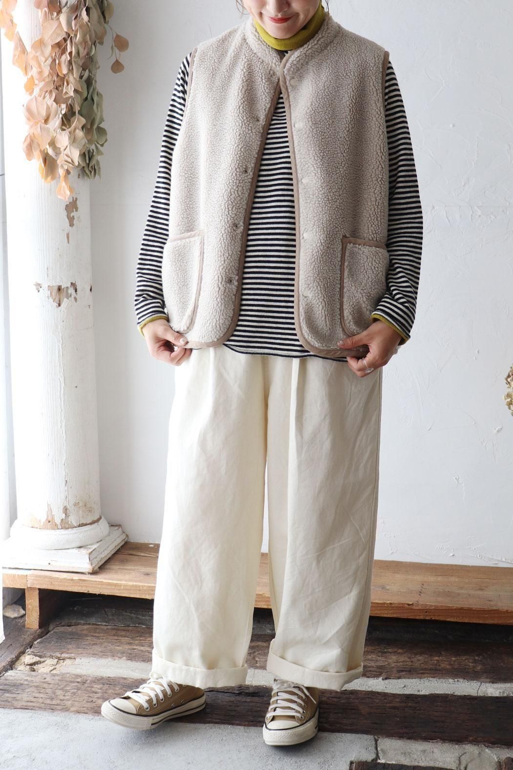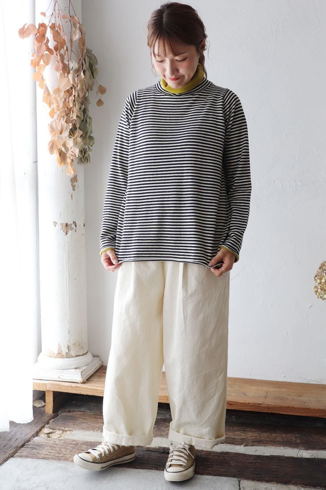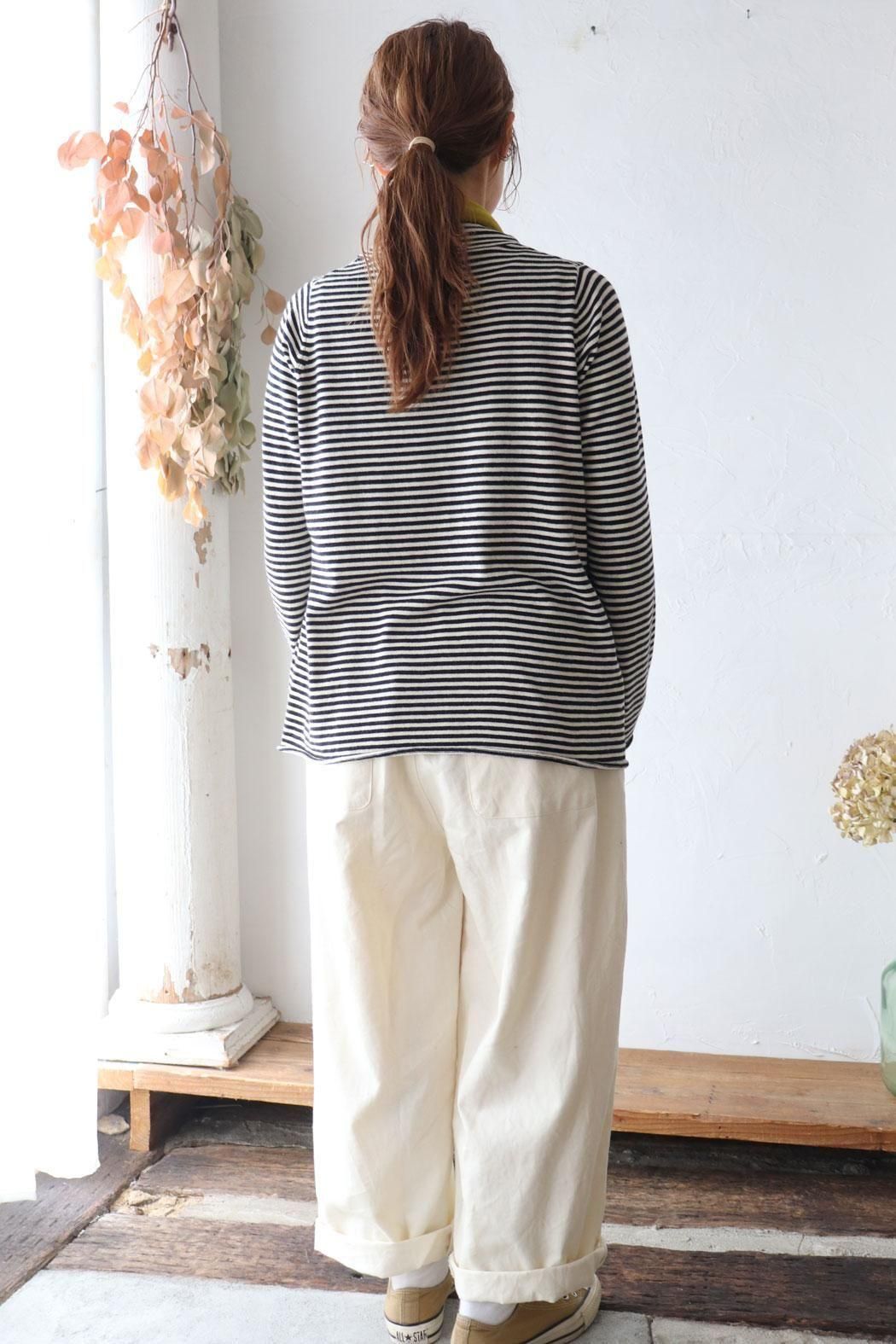 細めのピッチのボーダー柄なので、どんなアイテムとも相性良く〇