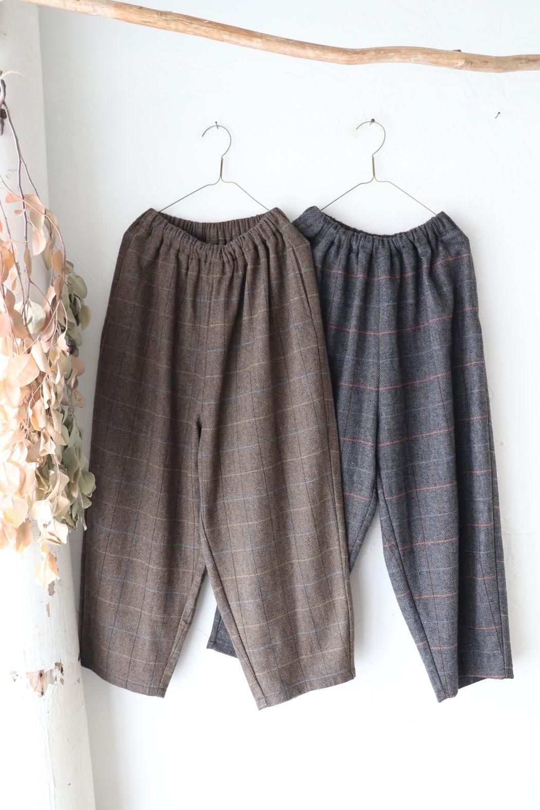 温かみのある配色のチェック柄が大人可愛いテーパードパンツ。