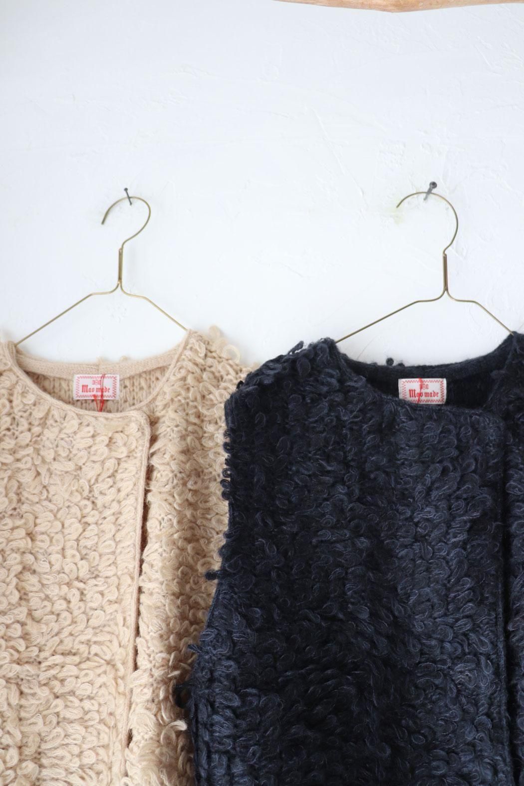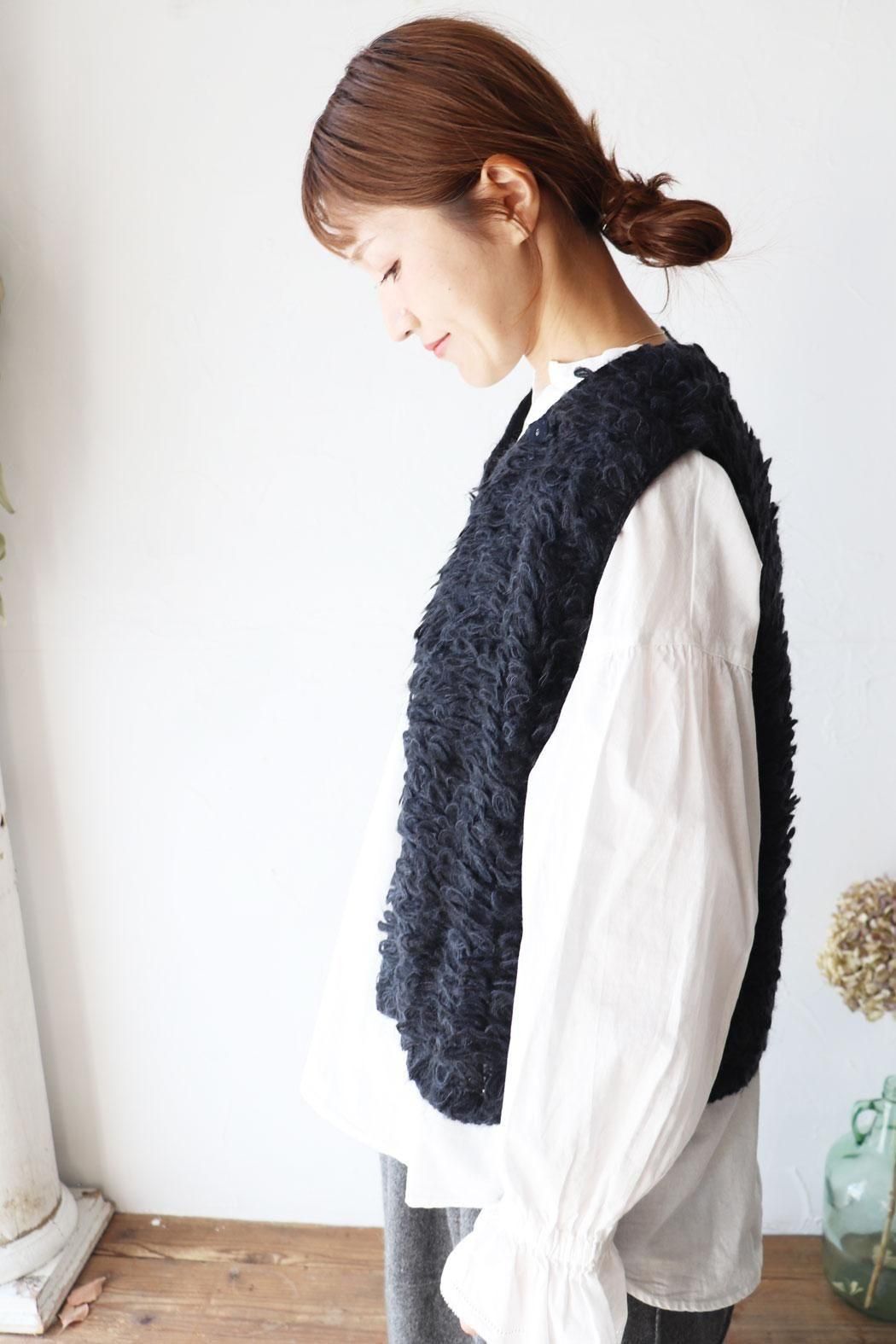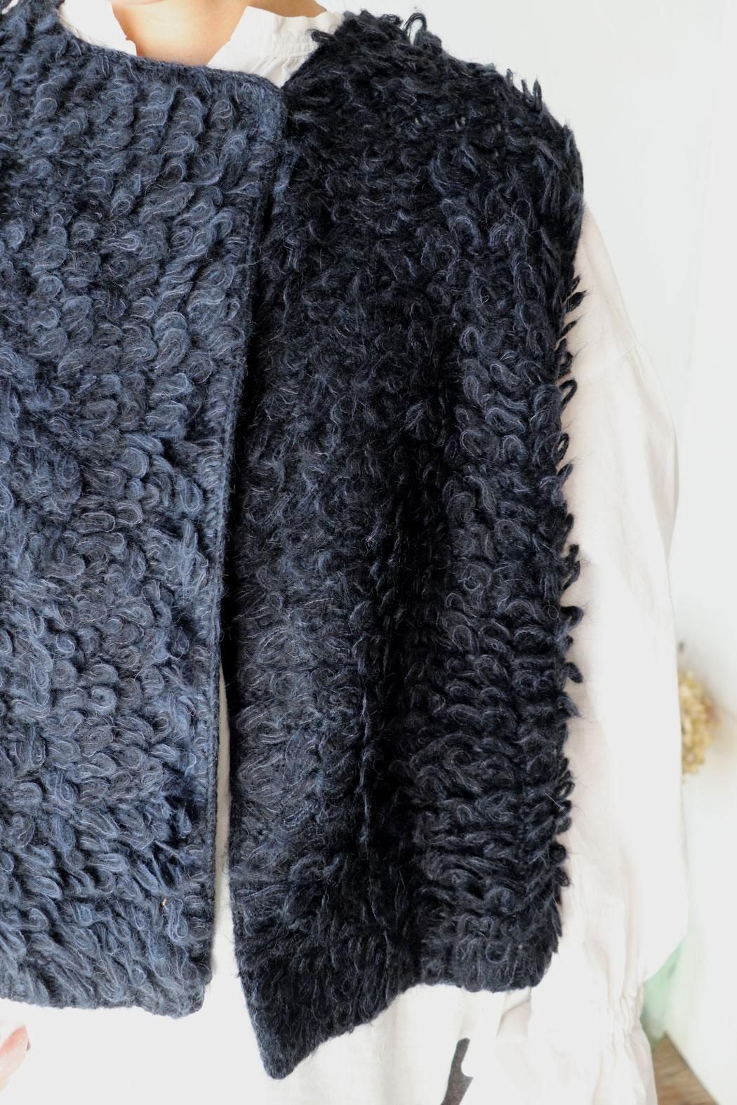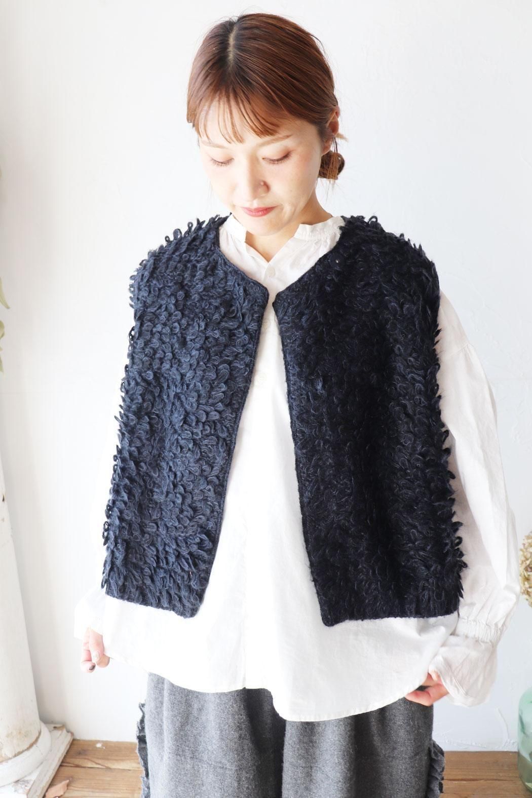 モヘアブレンドの毛足の長いふわふわとした糸をループ編みにしたベスト。