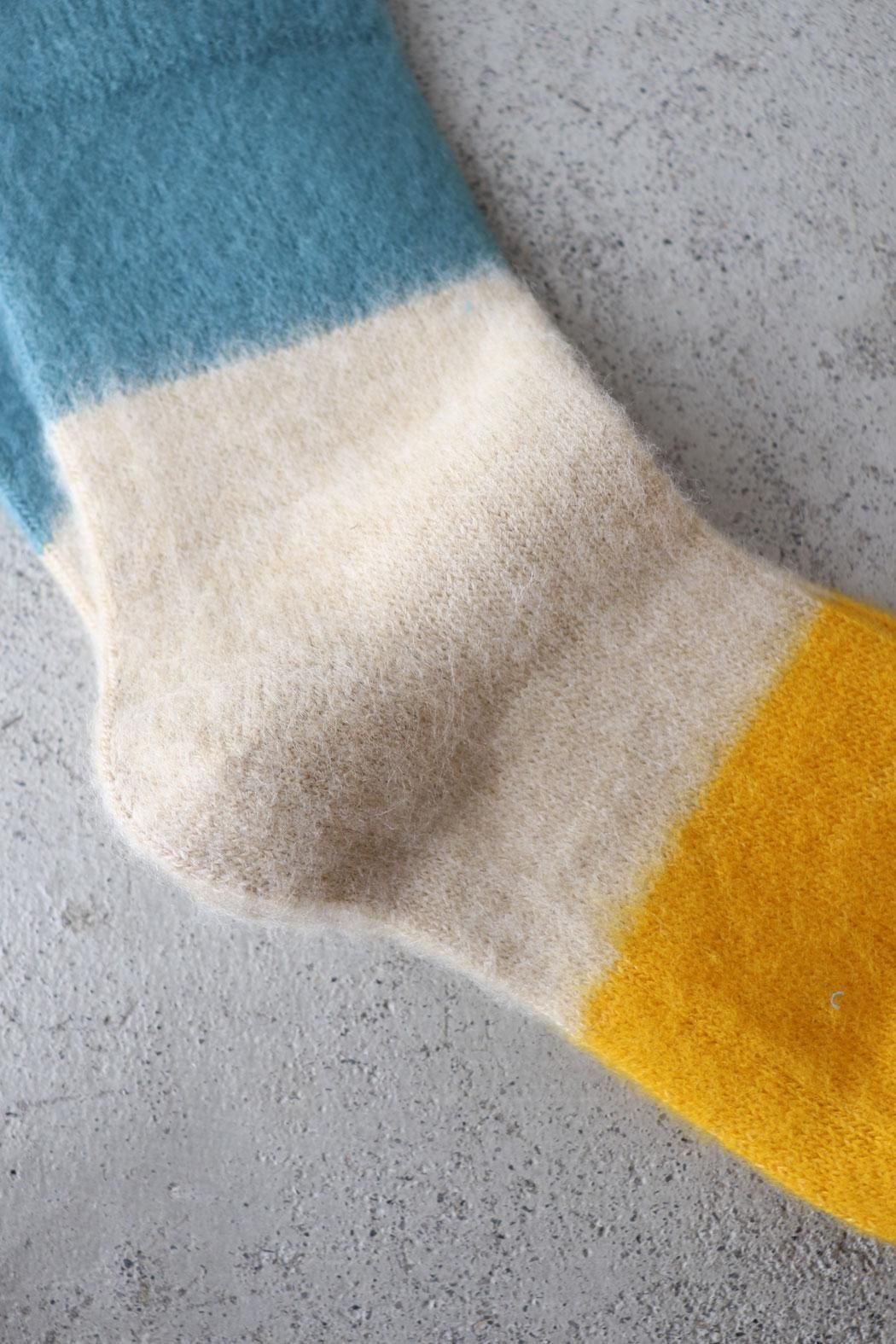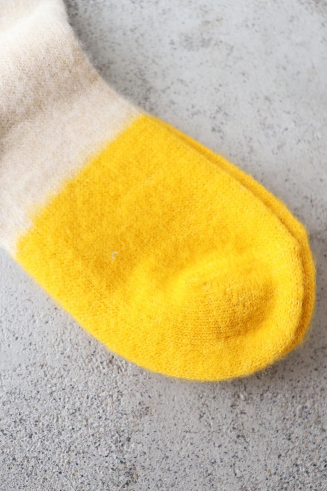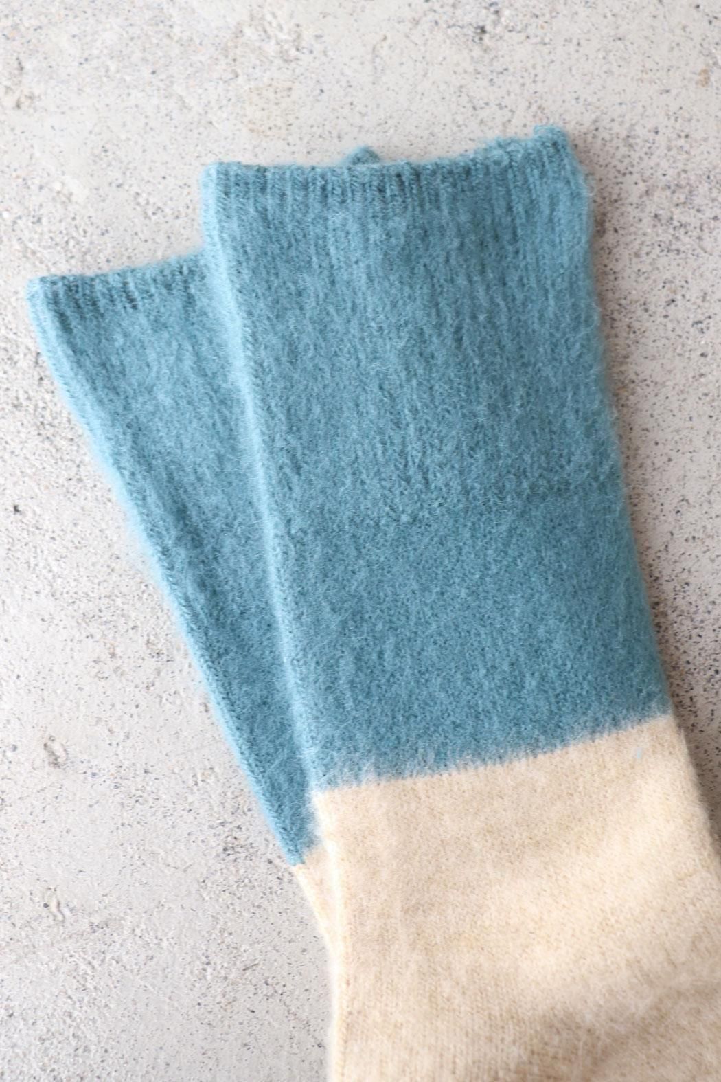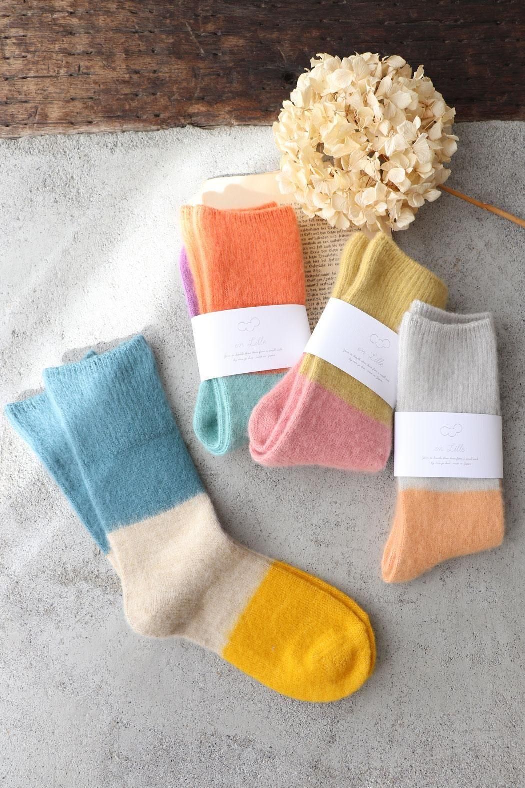 コットンとアクリルウールを引き揃えた編地に起毛をかけたふわふわとした履き心地が特徴です。