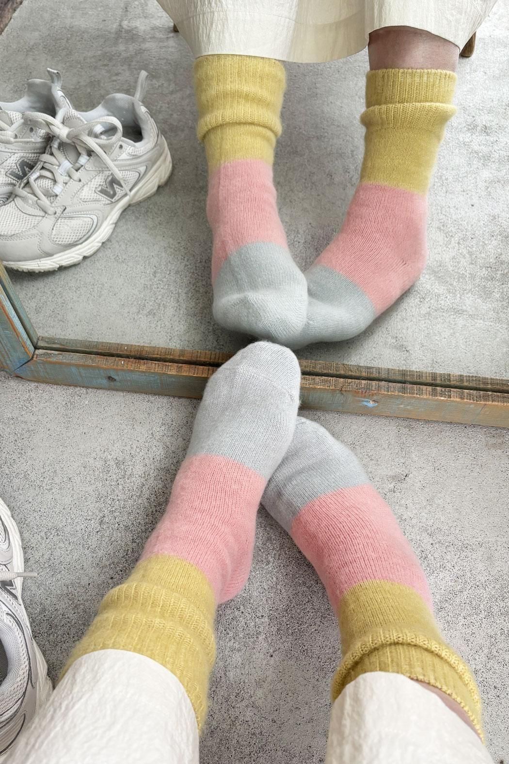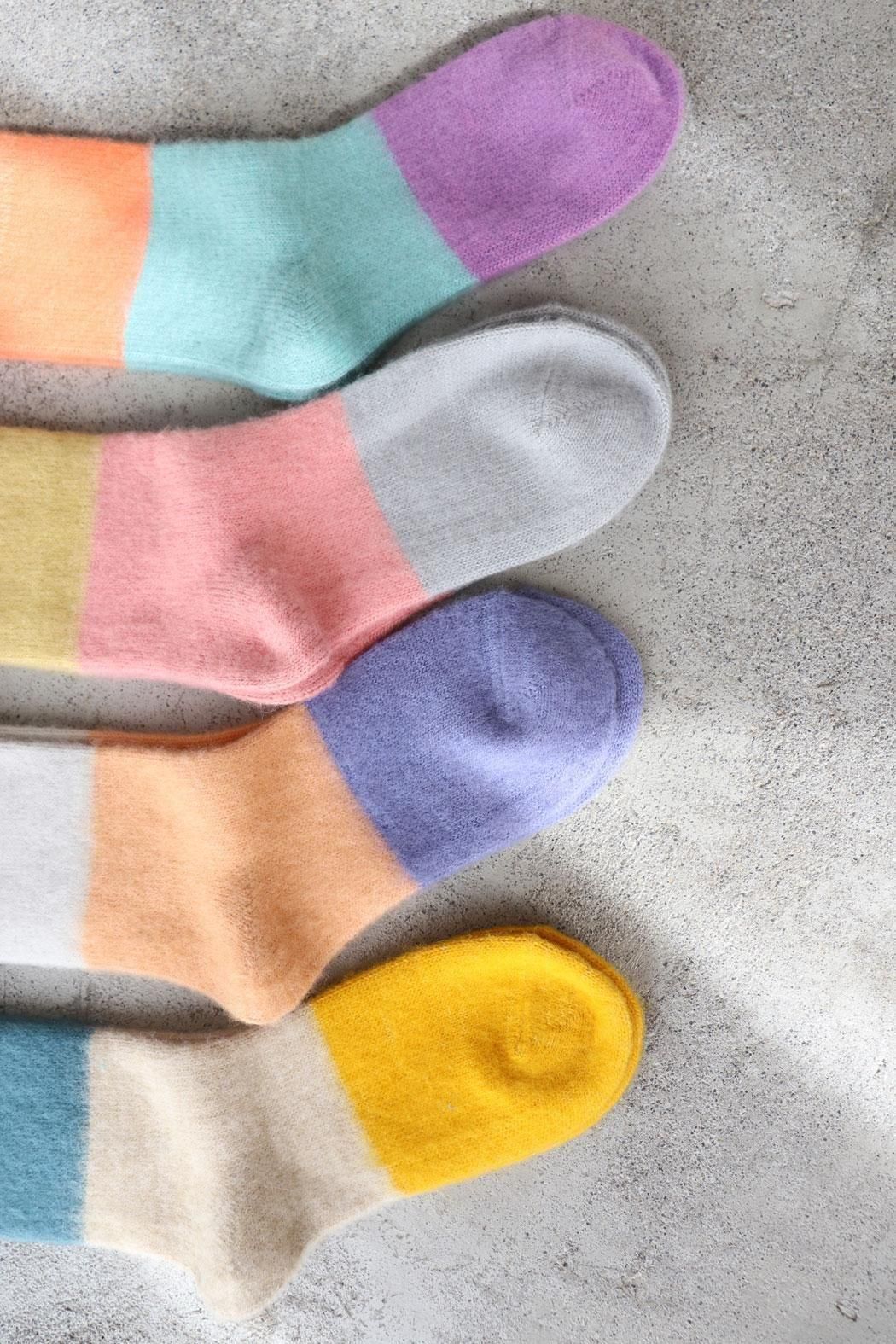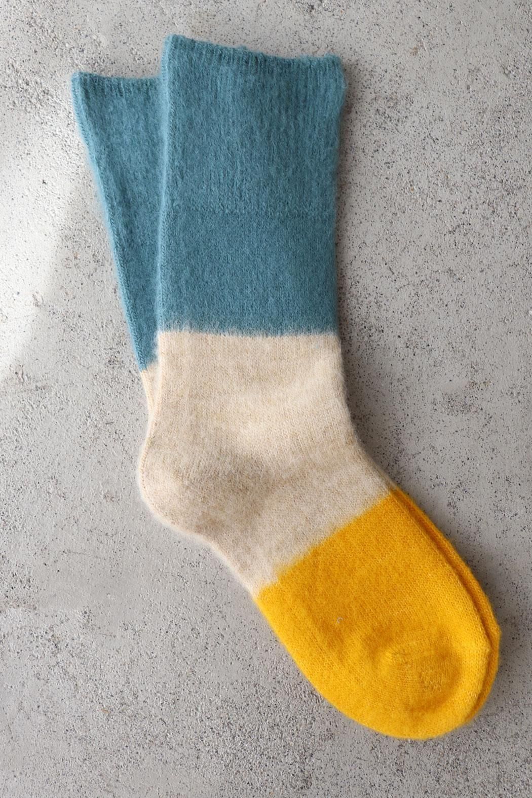 コットンとアクリルウールを引き揃えた編地に起毛をかけたふわふわとした履き心地が特徴です。
