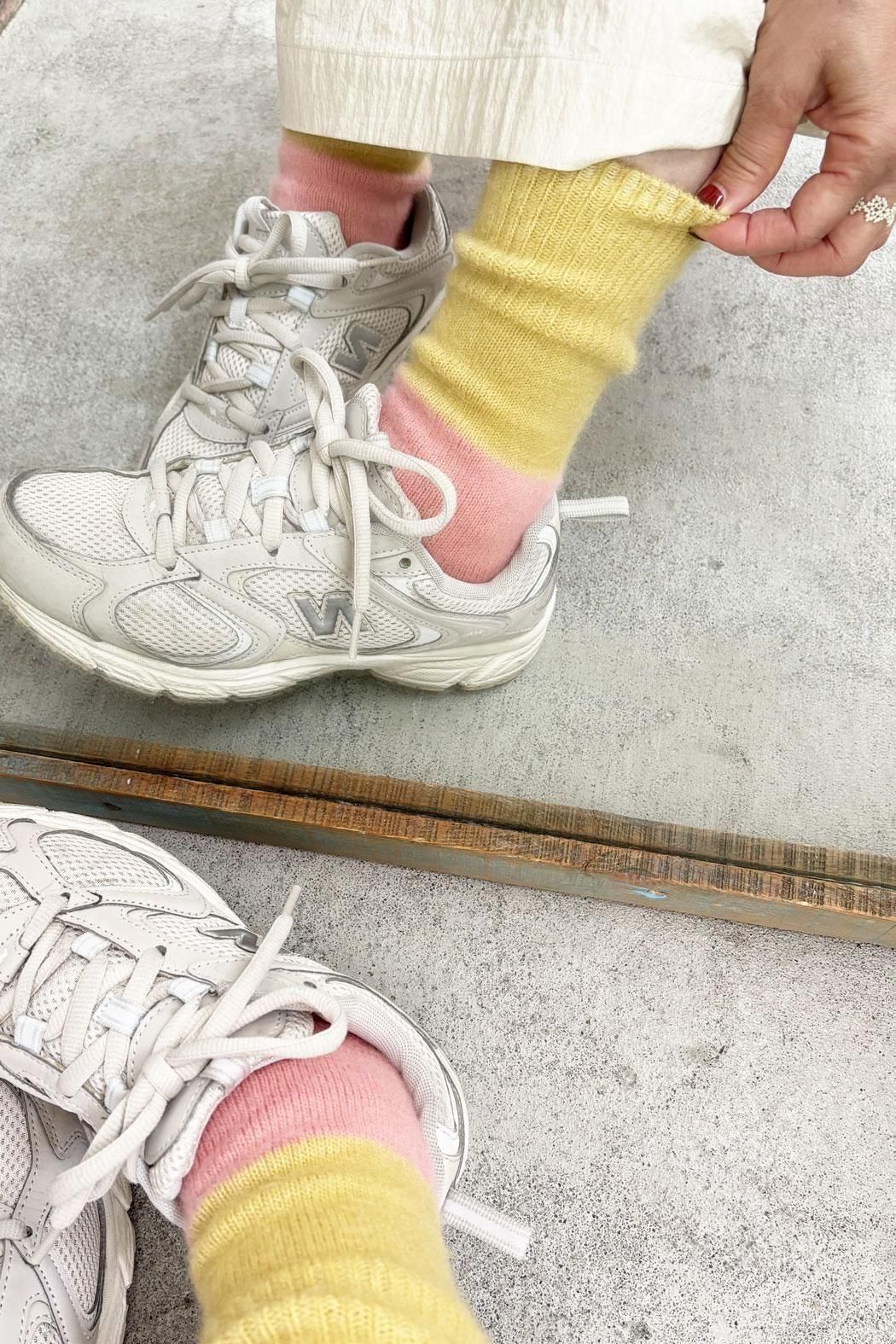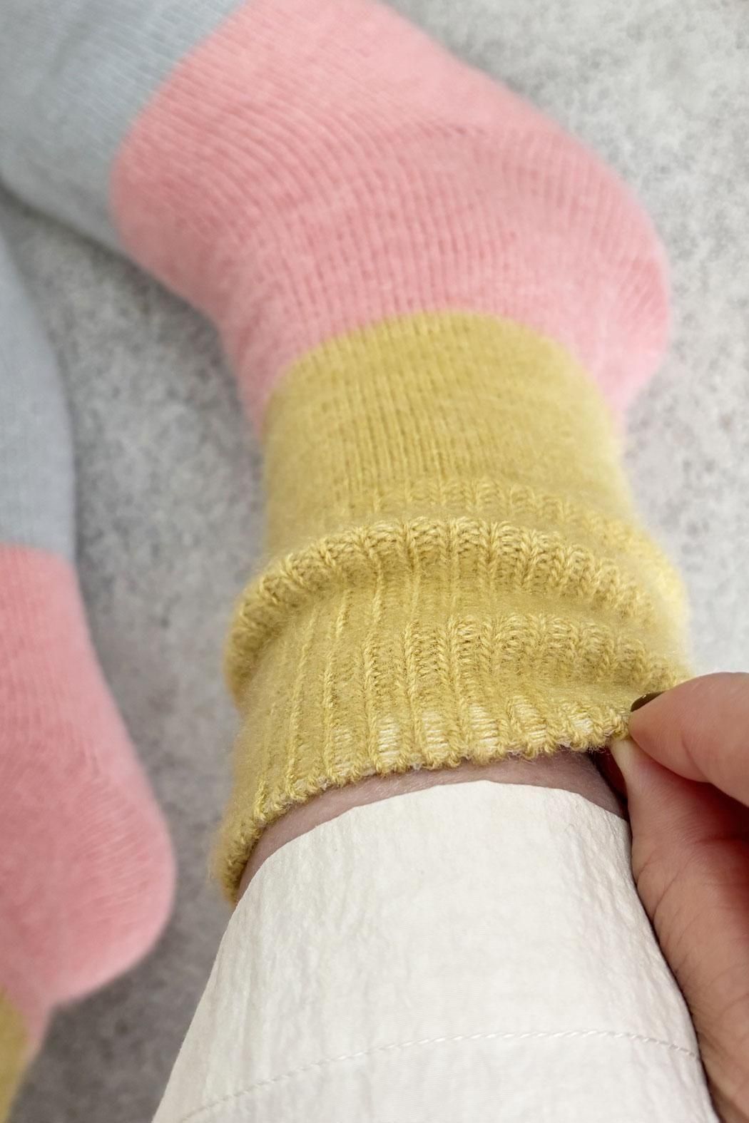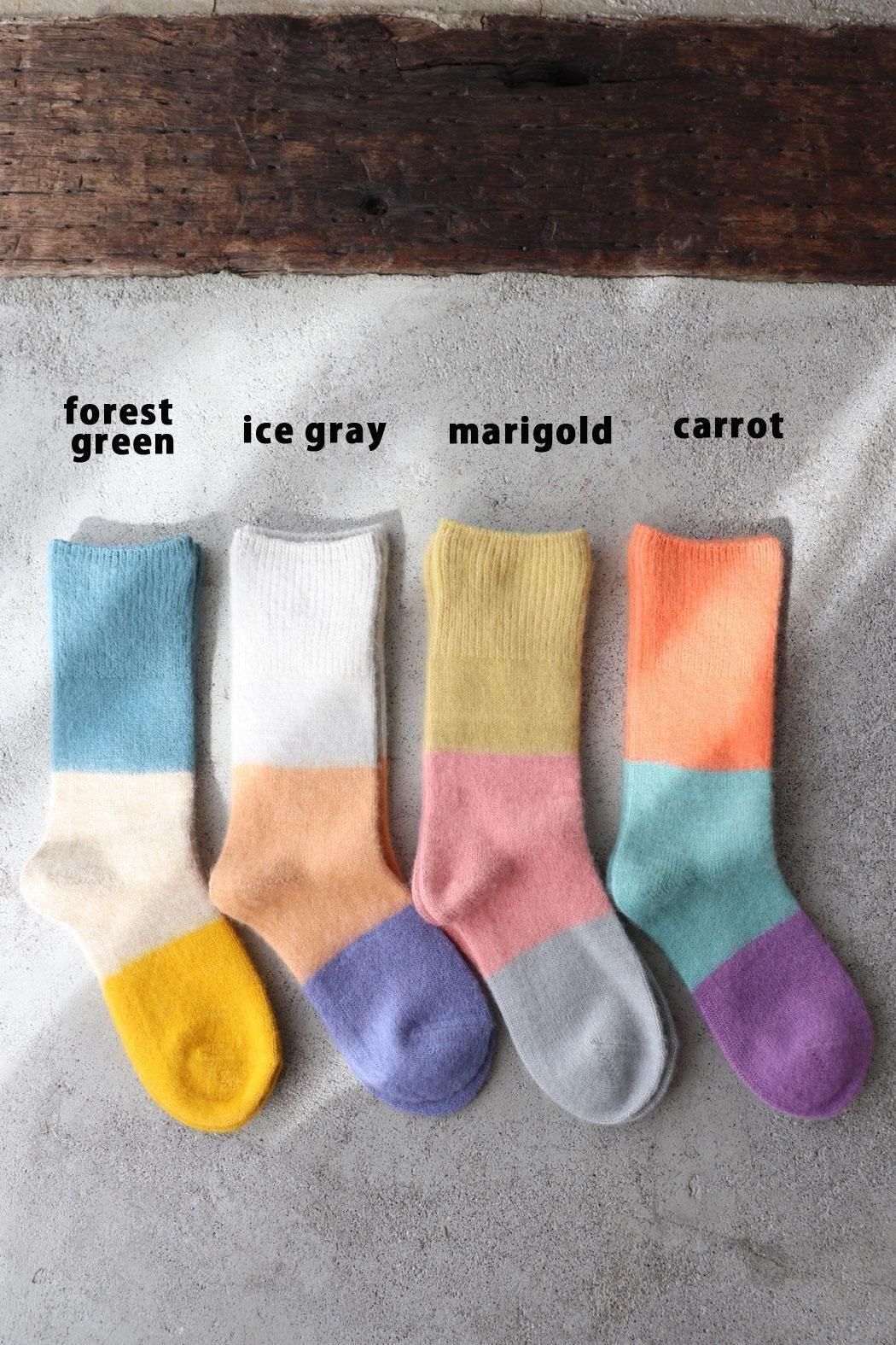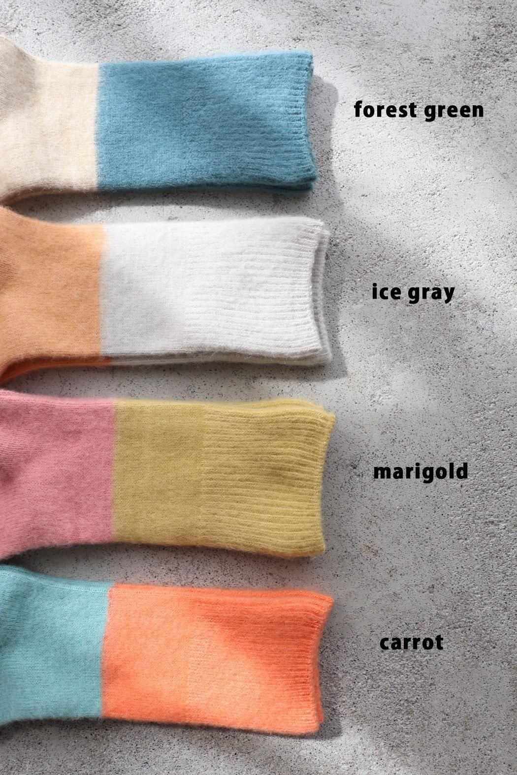 コットンとアクリルウールを引き揃えた編地に起毛をかけたふわふわとした履き心地が特徴です。