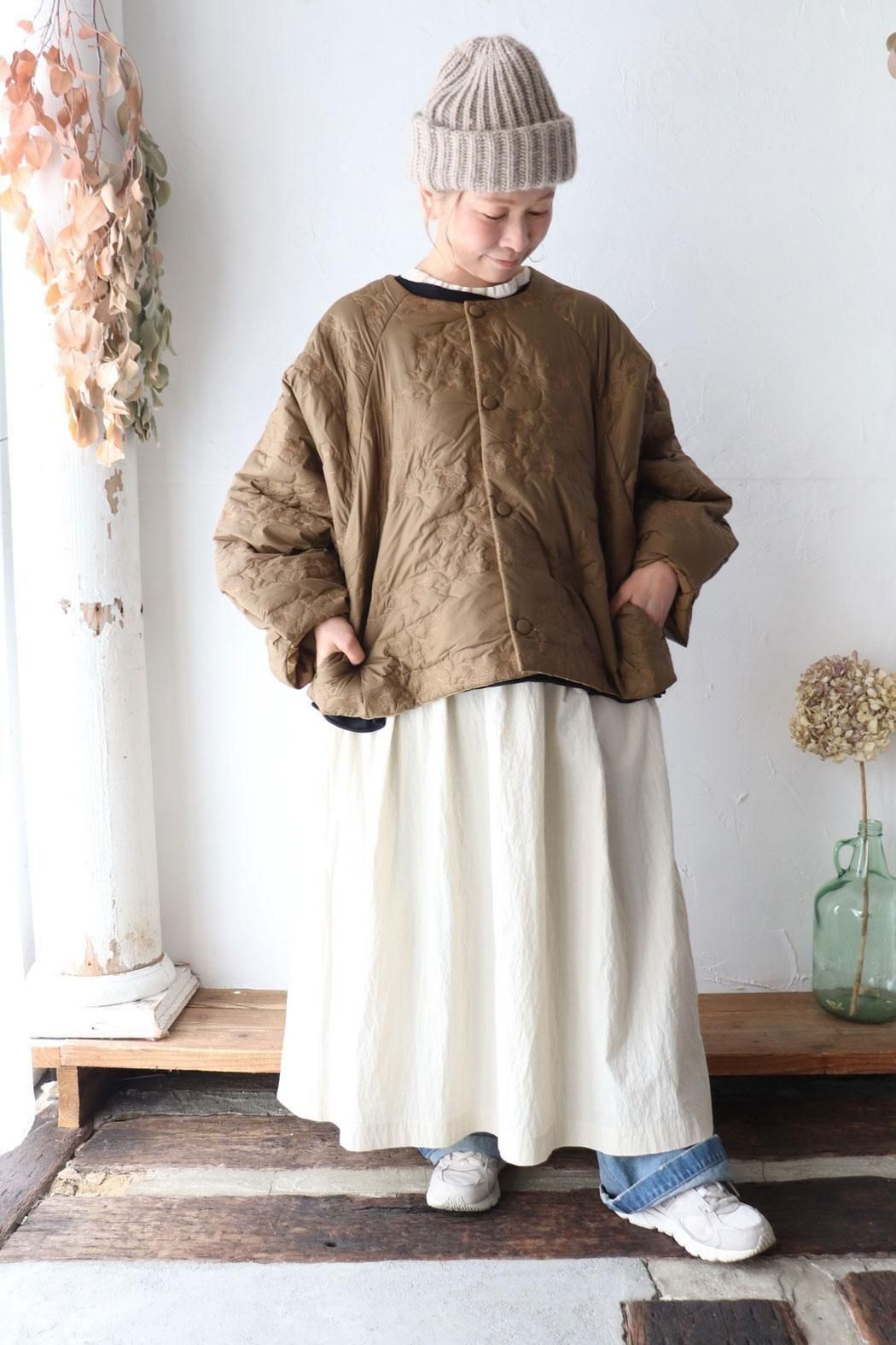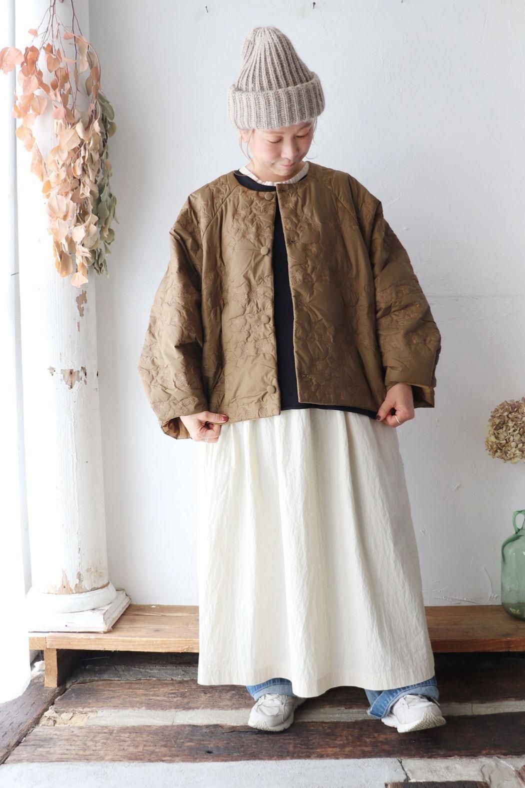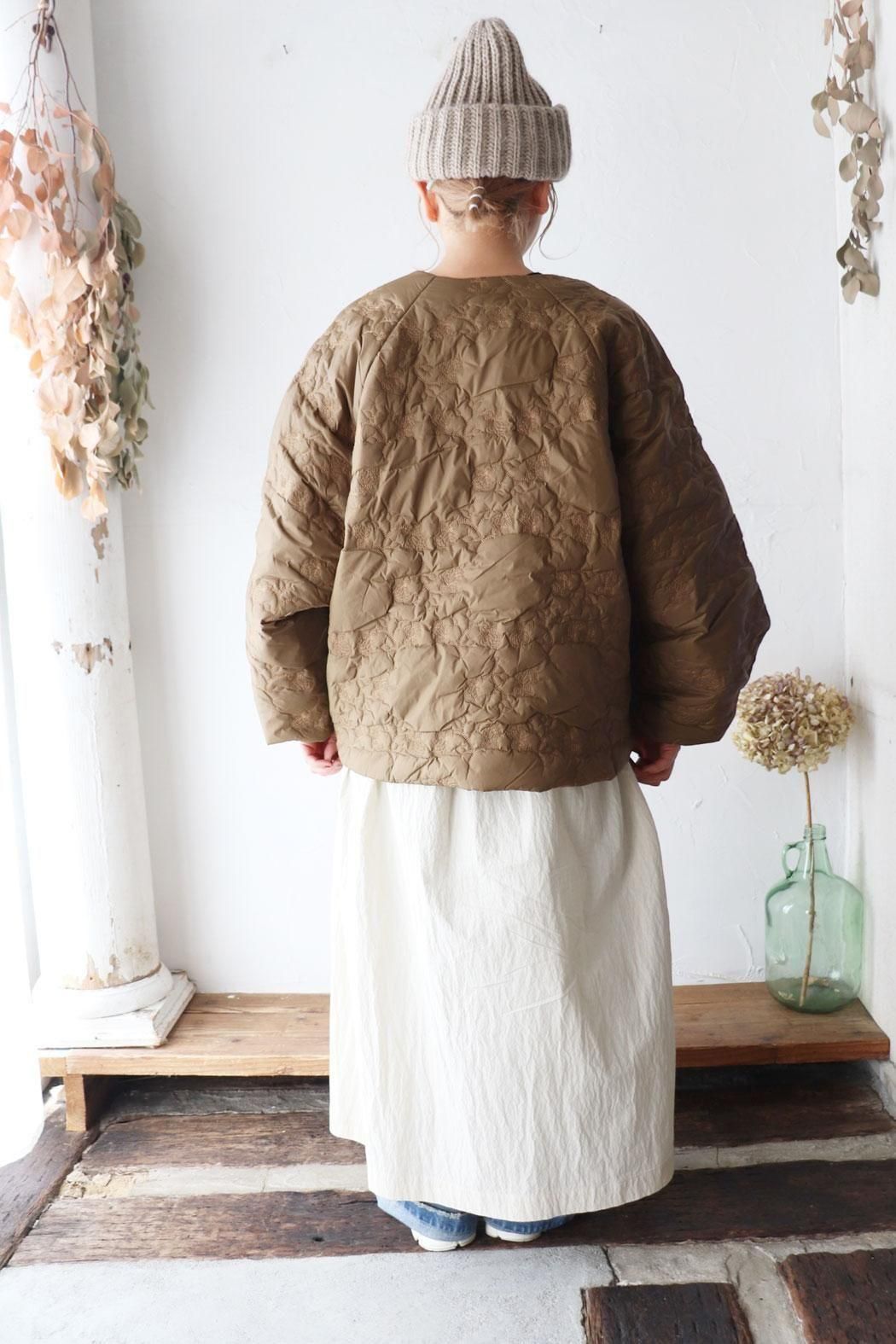 ナイロン素材に花柄を刺繍したキルティングのノーカラージャケット。