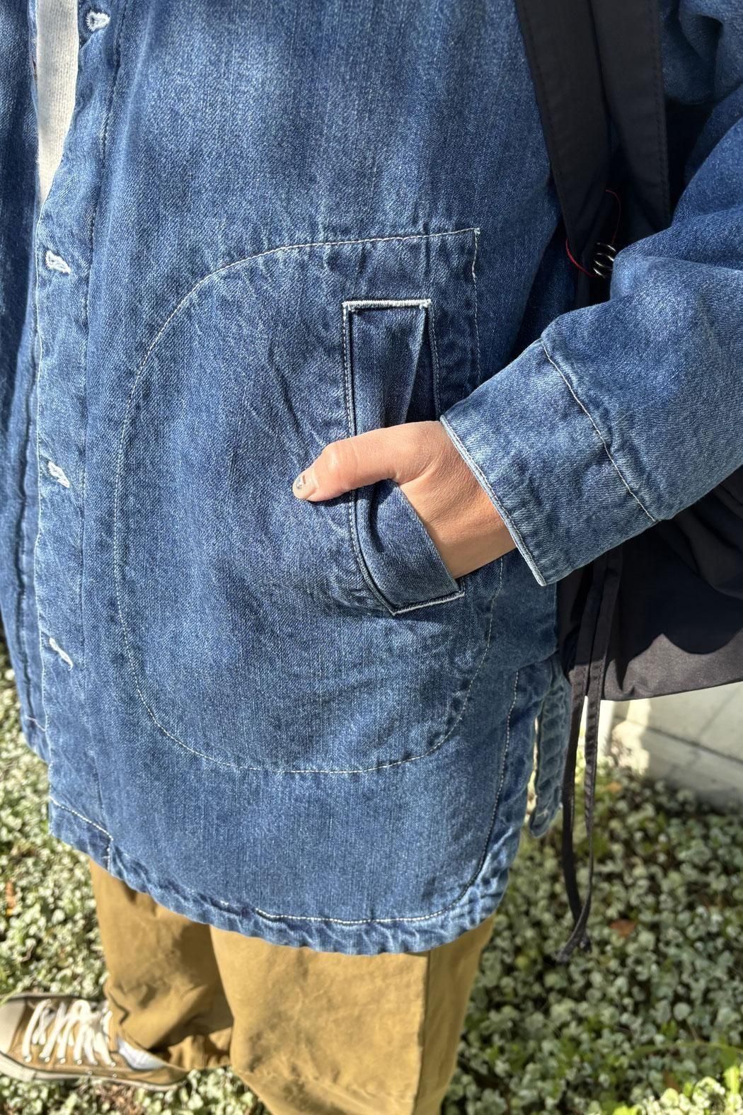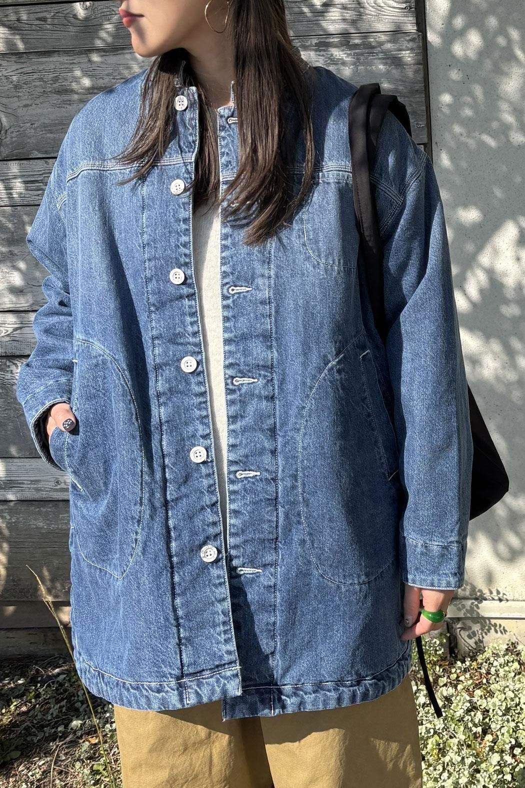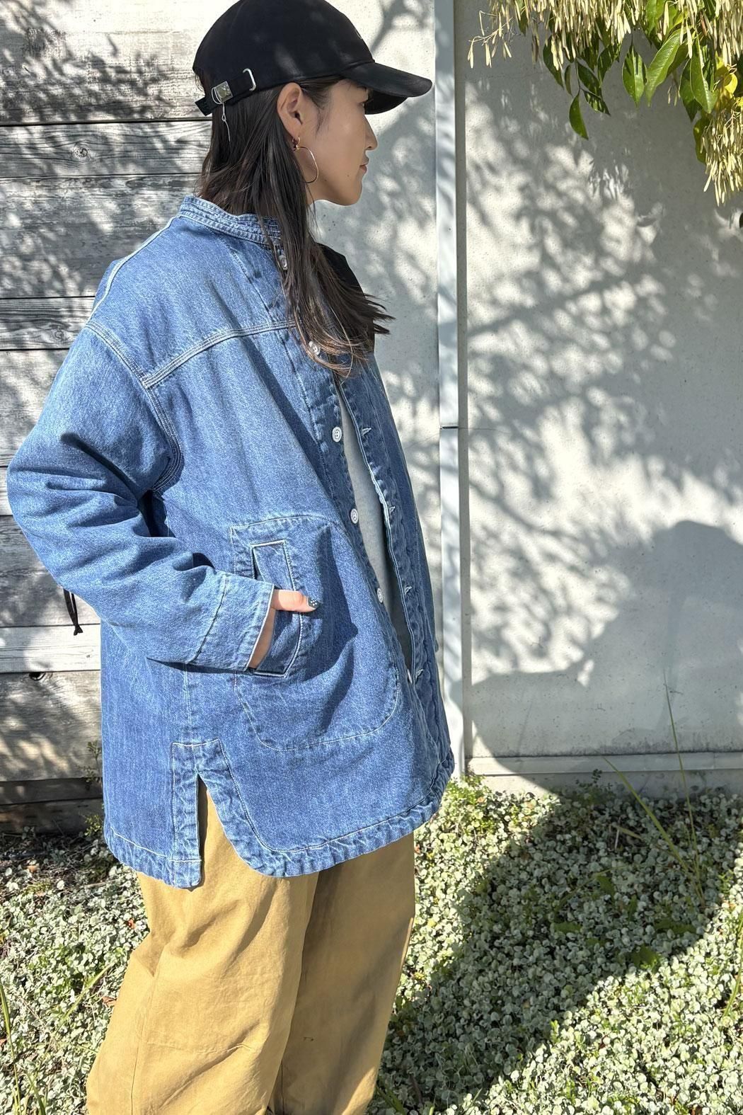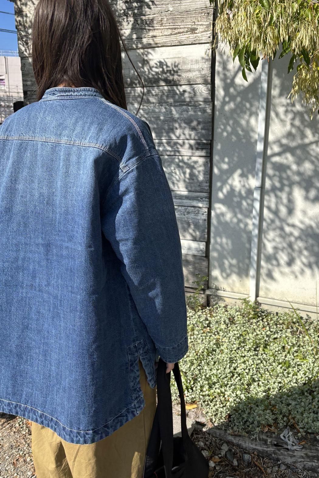 しっかりと厚みのあるデニム素材で仕立てた中綿コート。