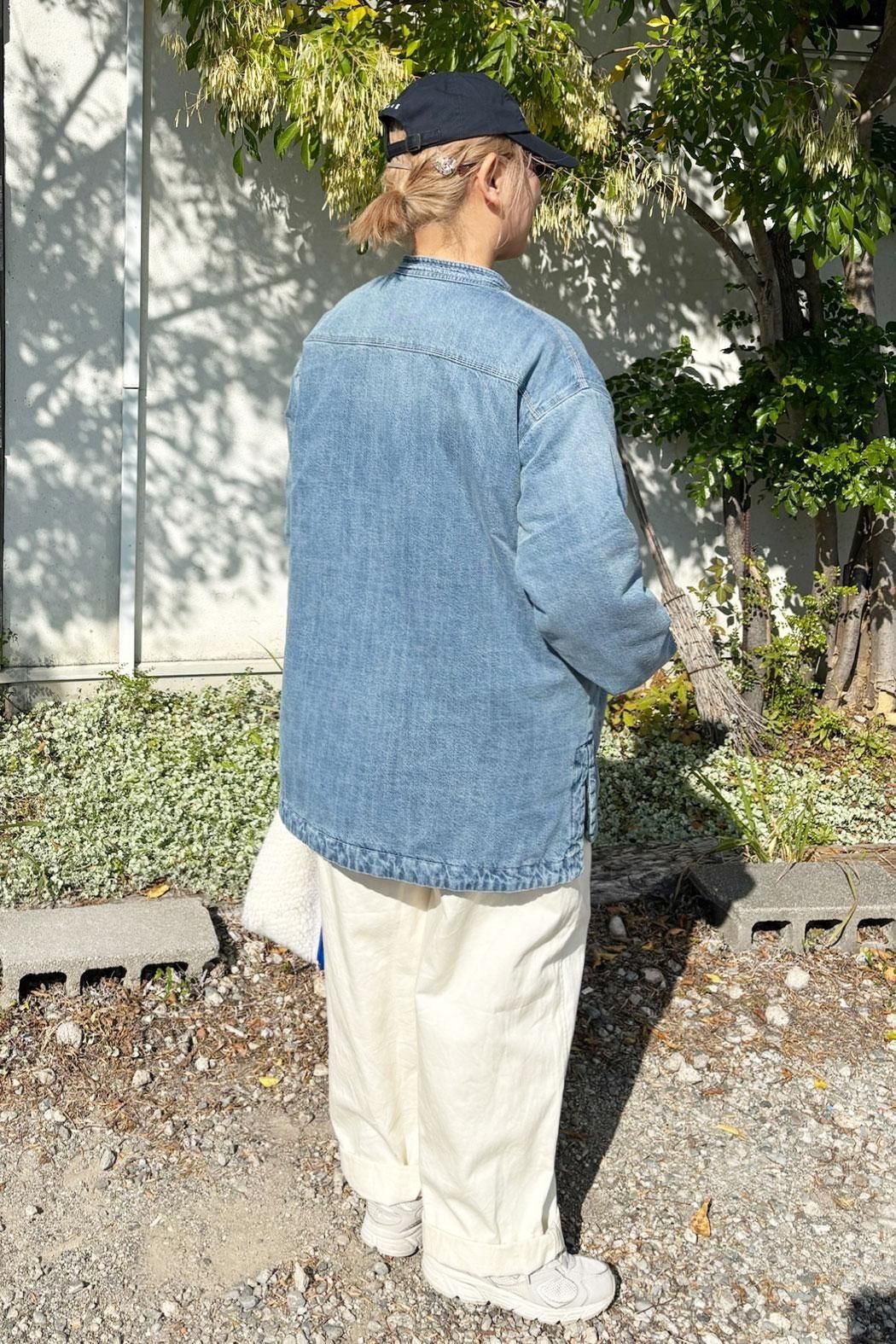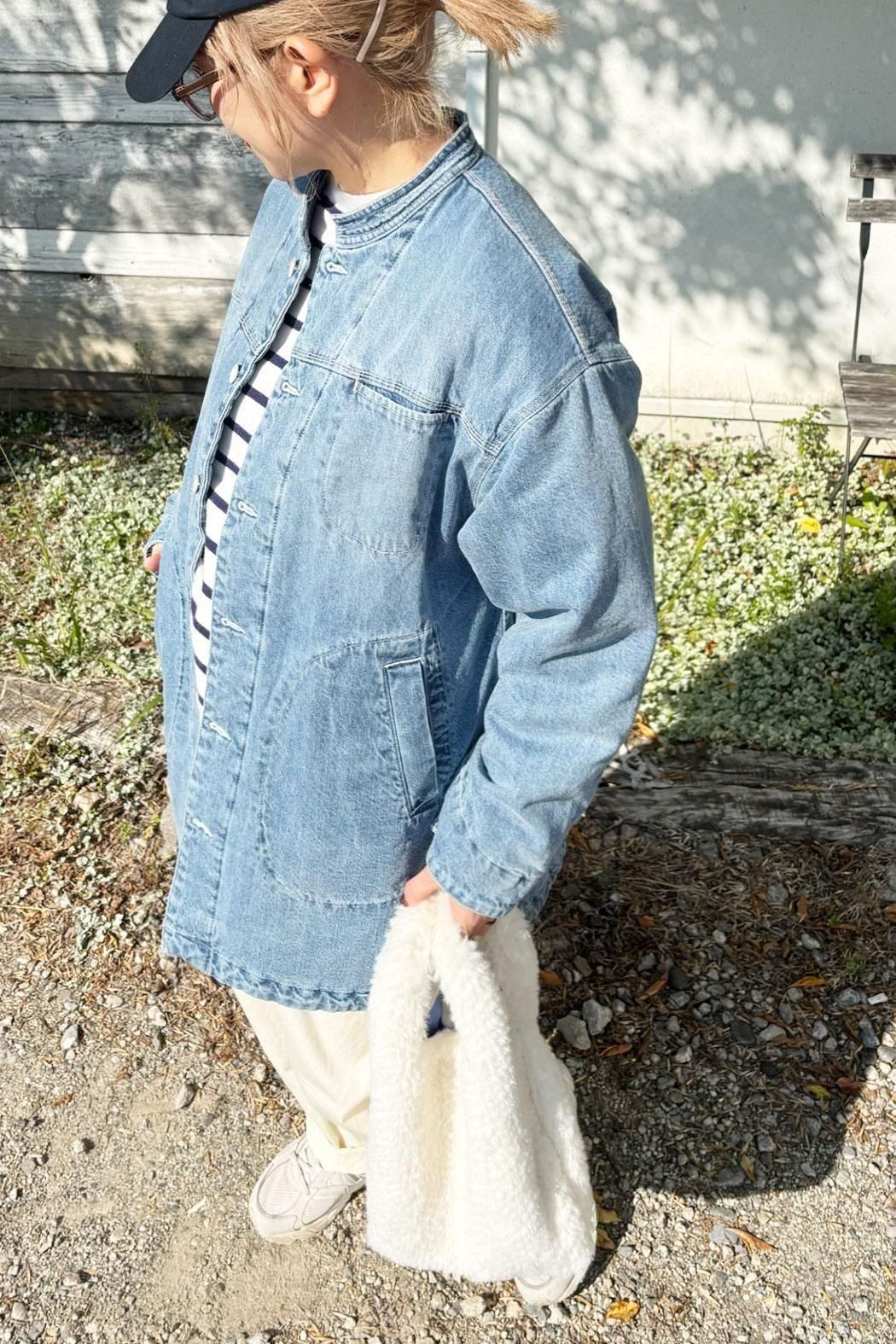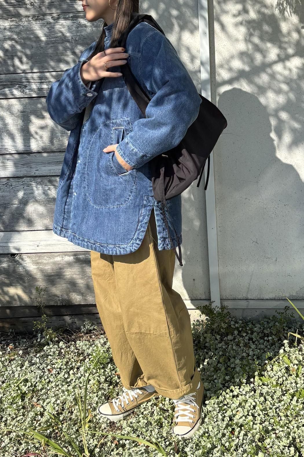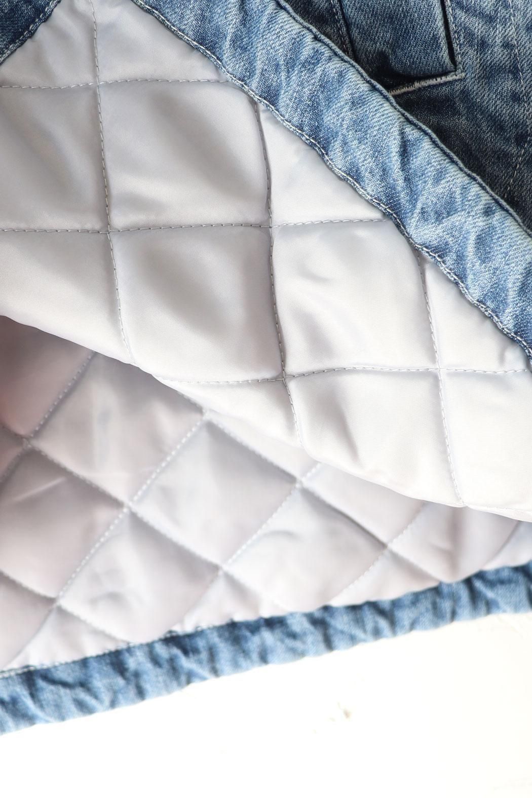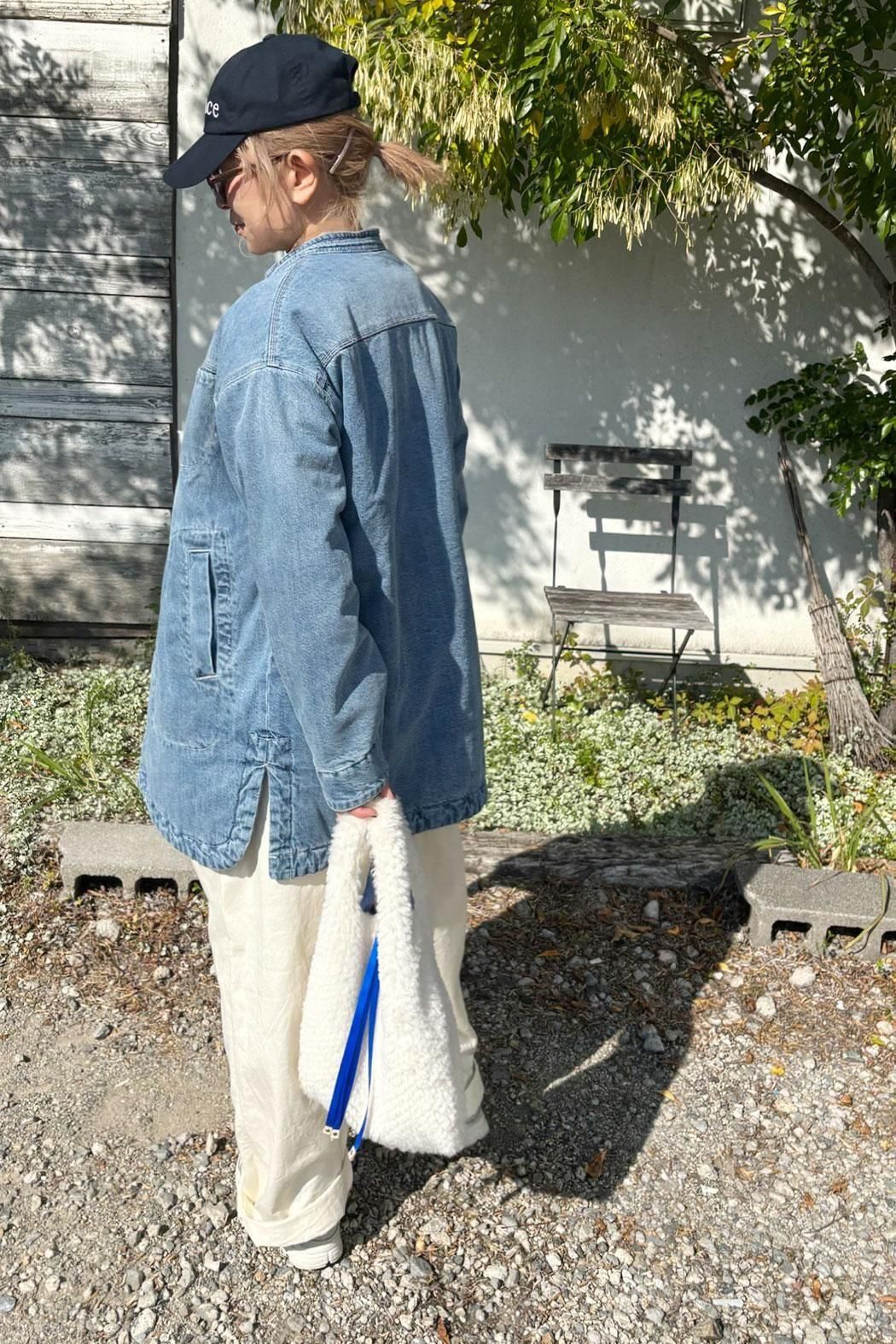 しっかりと厚みのあるデニム素材で仕立てた中綿コート。