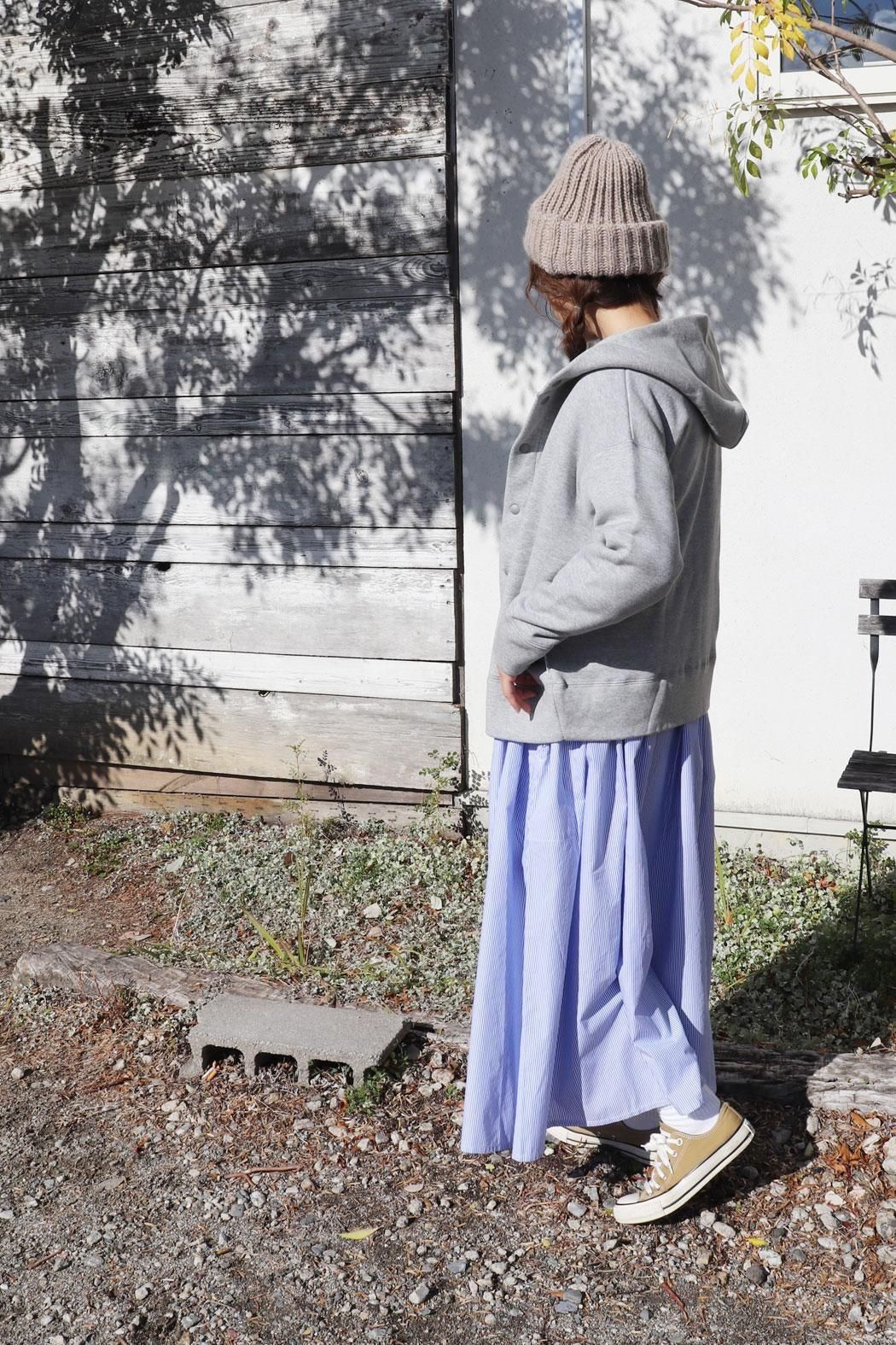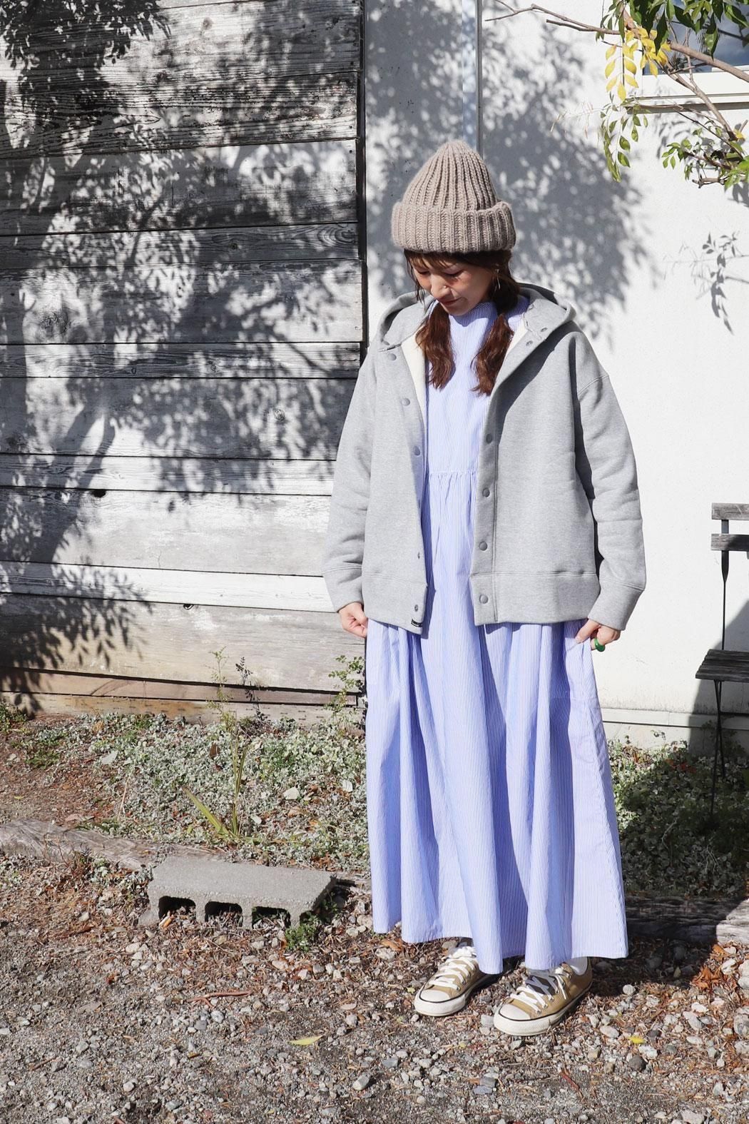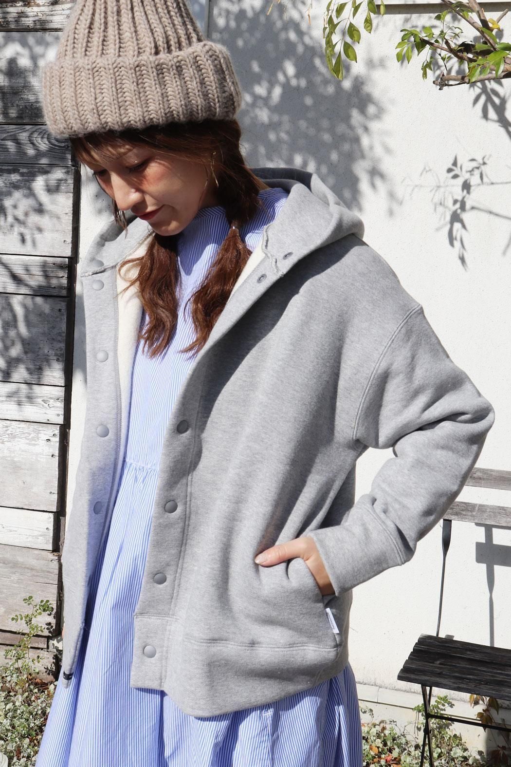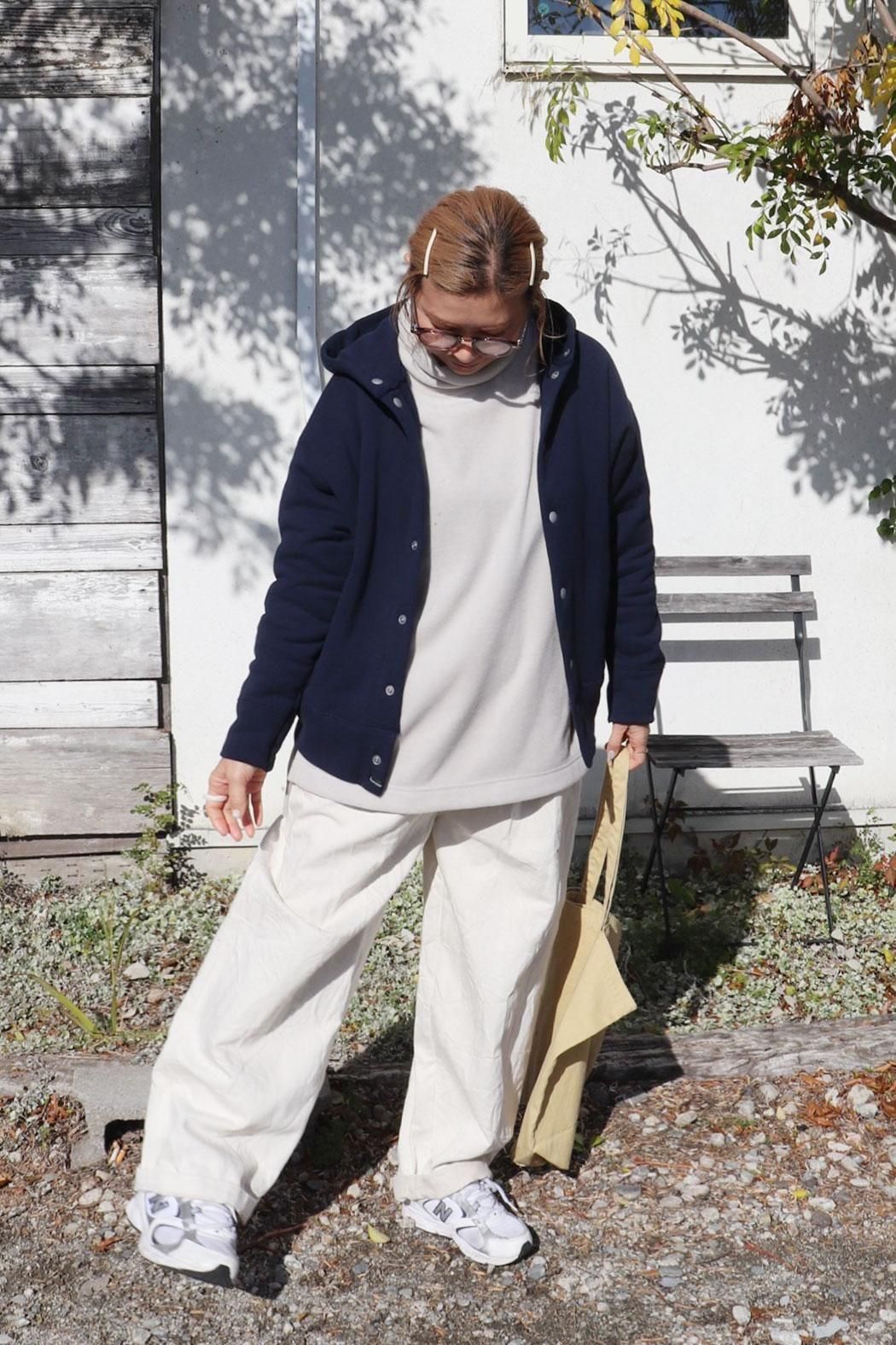 フードを付けることで、首回りもしっかり温かく、レイヤードにもひと役*