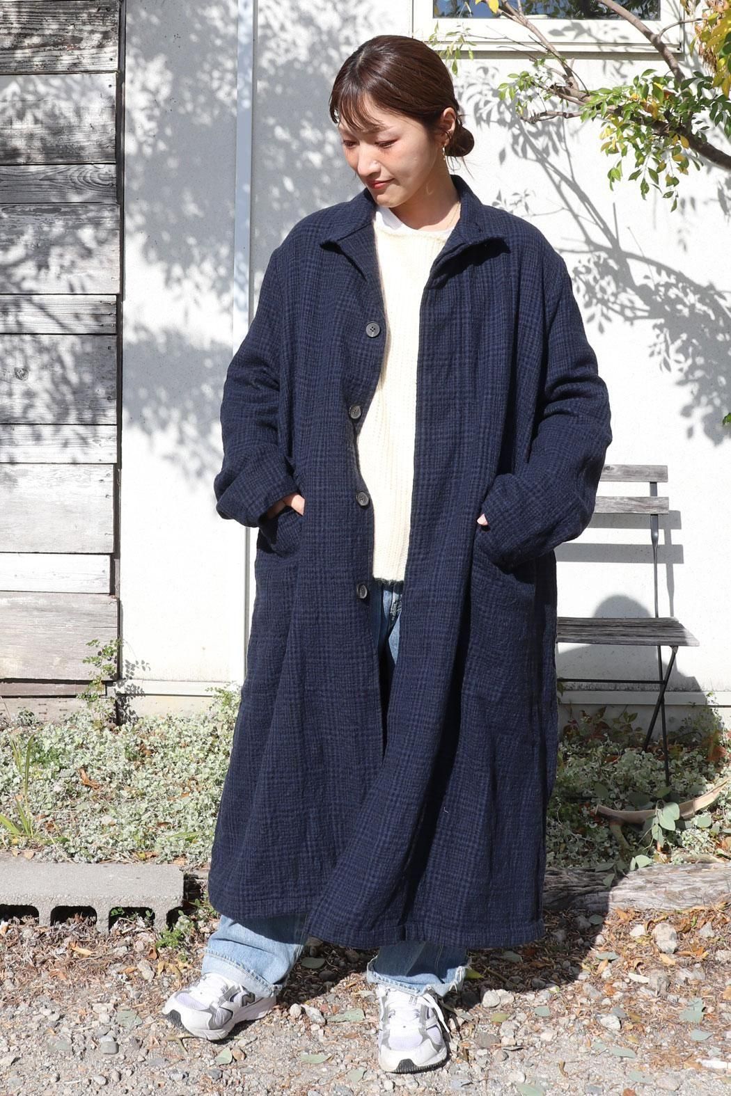 ふっくらとした軽さと温かみのある風合いが魅力のロングコート。